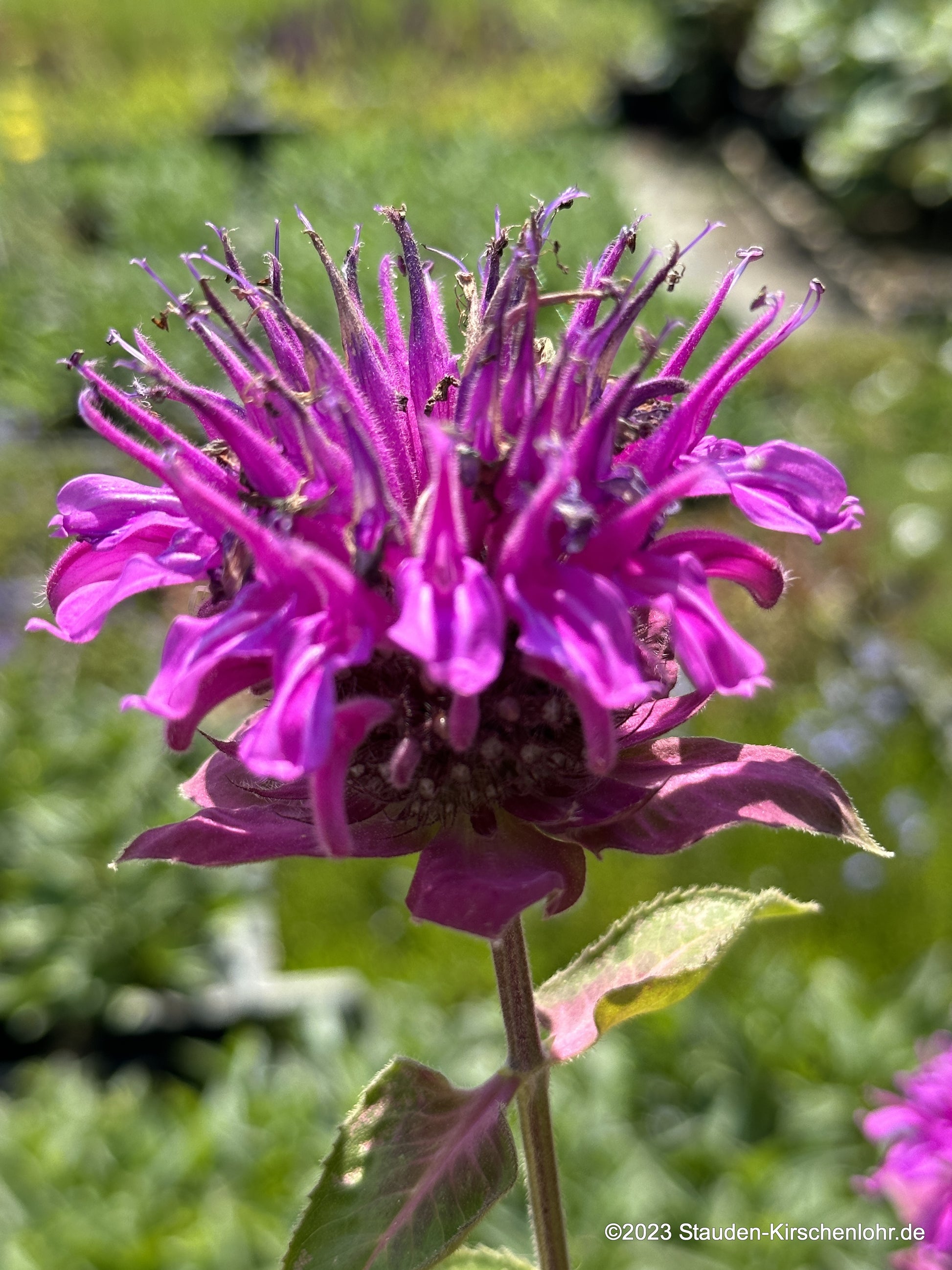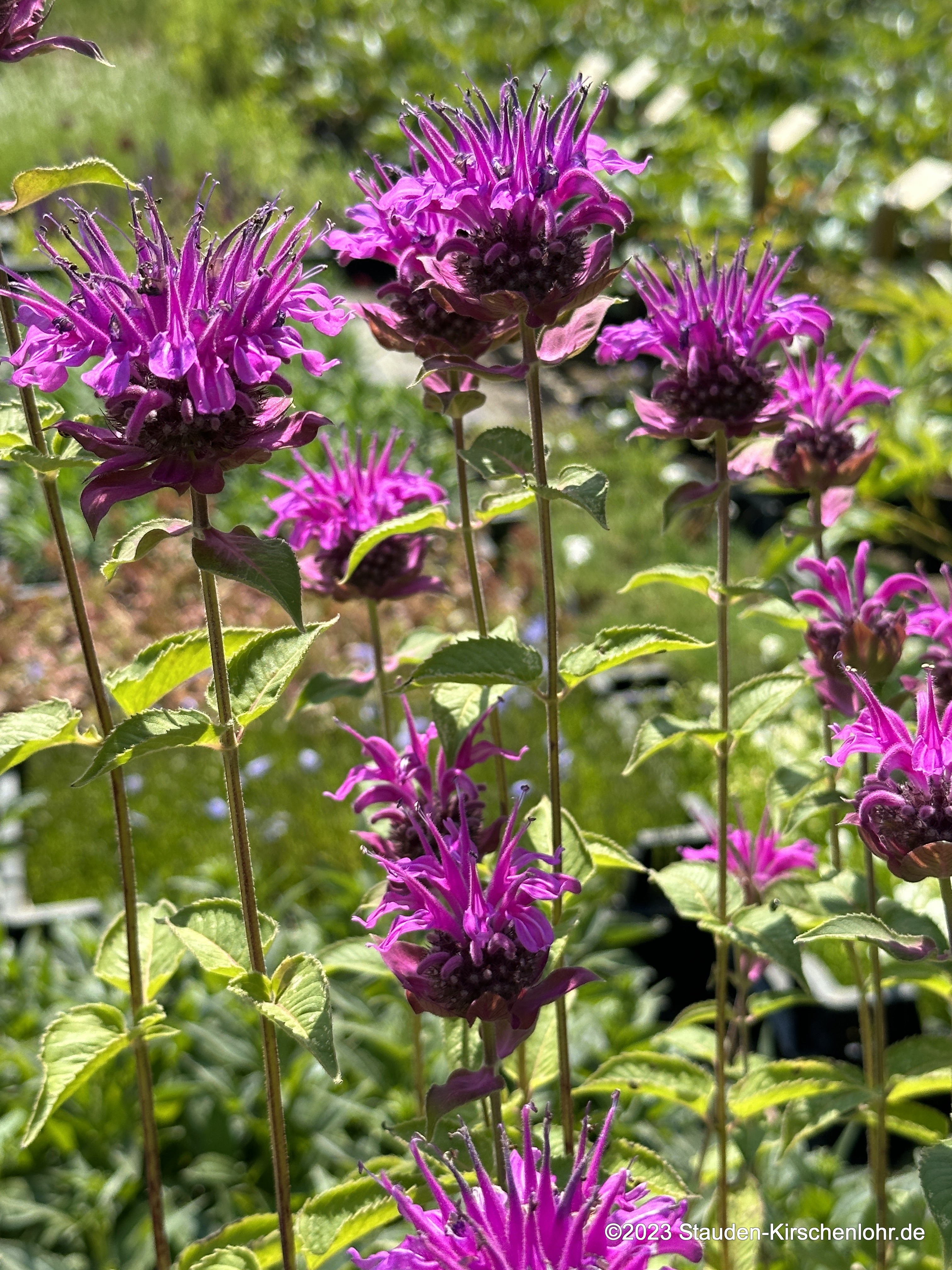 Purpurrosa Lippenblüten, etagen- bis quirlartig angeordnet. Blütenstand über rotbraunen Hochblättern. Breitlanzettliche Blätter mit gesägtem Blattrand. Intensiv duftender Klon. Kaum mehltauanfällig. Sommergün.