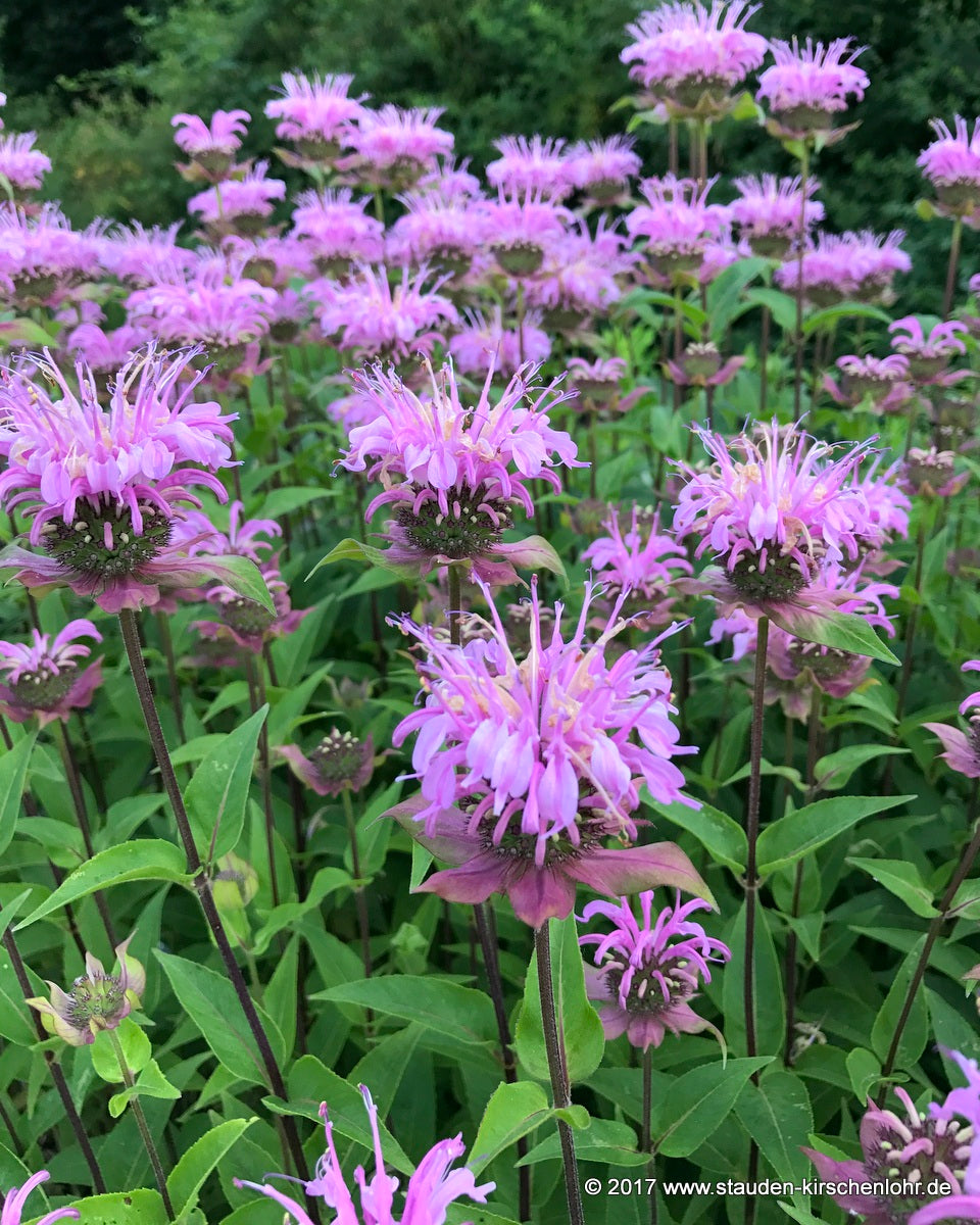 Lilarosa, lange Lippenblüten, etagen- bis quirlartig angeordnet. Interessante Farbe. Blütenstand über rotbraunen Hochblättern. Breitlanzettliche Blätter mit gesägtem Blattrand. Sommergün.