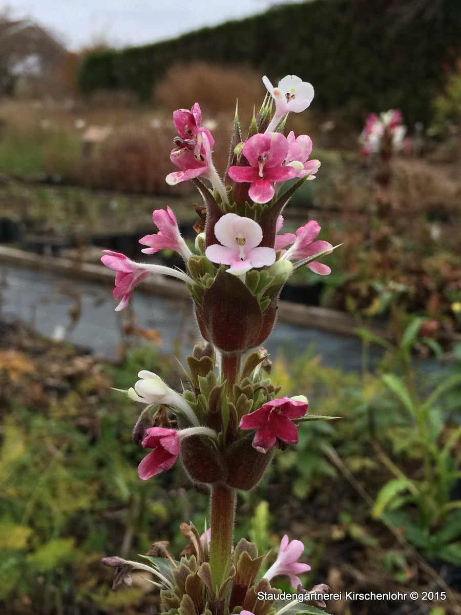Zahlreiche, langröhrige Blüten in Quirlen; zuerst weiß, später mehr rosa. Kronlappen ausgebreitet. Blätter grundständig, schmallanzettlich, Blattrand dornig gezähnt. Stängel aufrecht, gegenständig beblättert. Wintergrün.