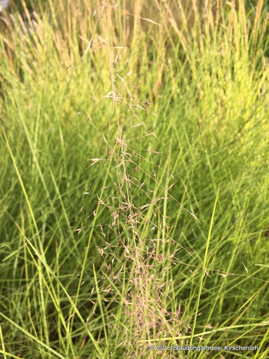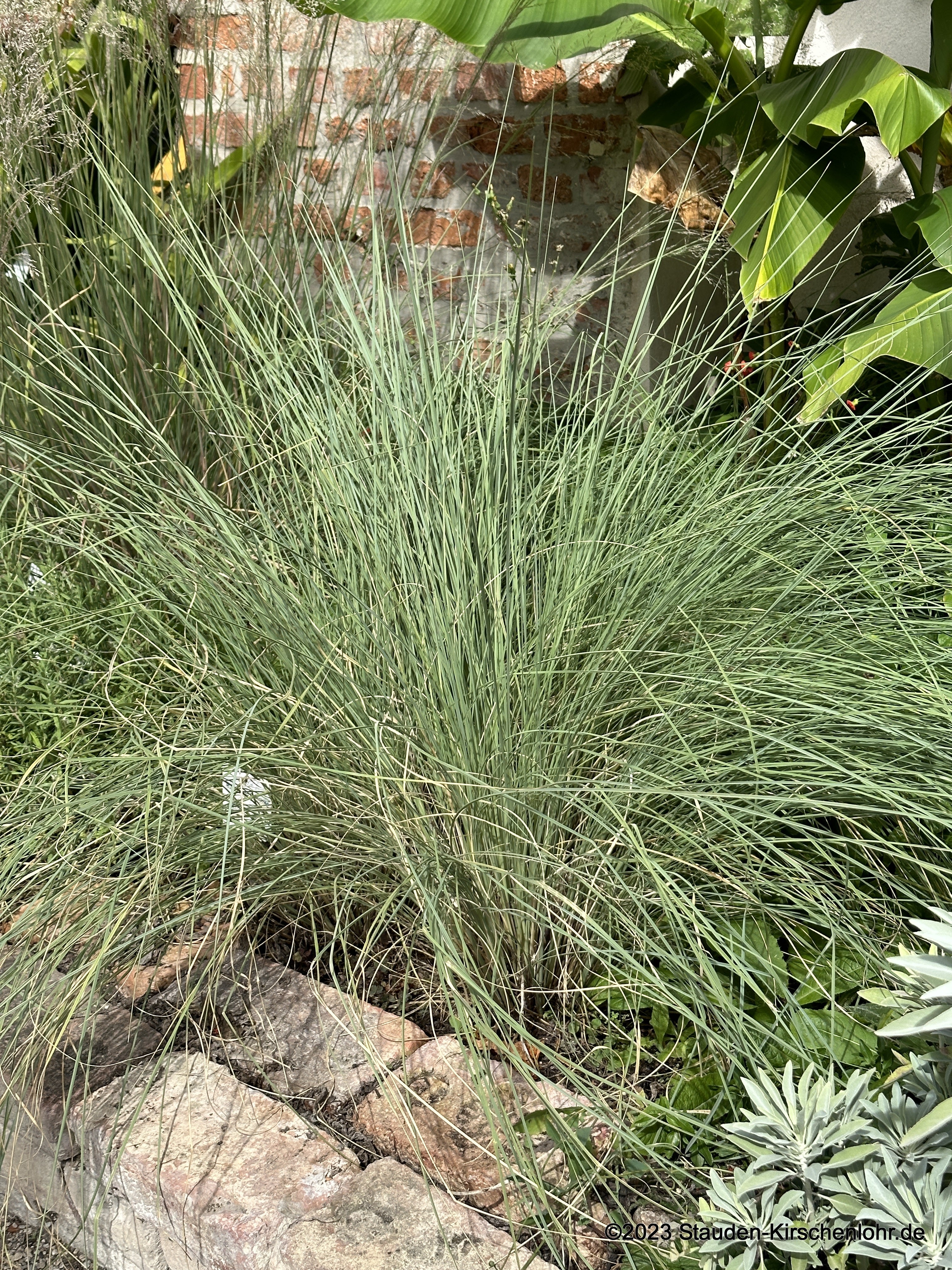 Gelbbraune, später hellpurpurfarbene, schlanke Blütenähren. Dichte, architektonisch wirkende Büsche, mit sehr schmalen, blau-grünen, nadelartigen Blättern.