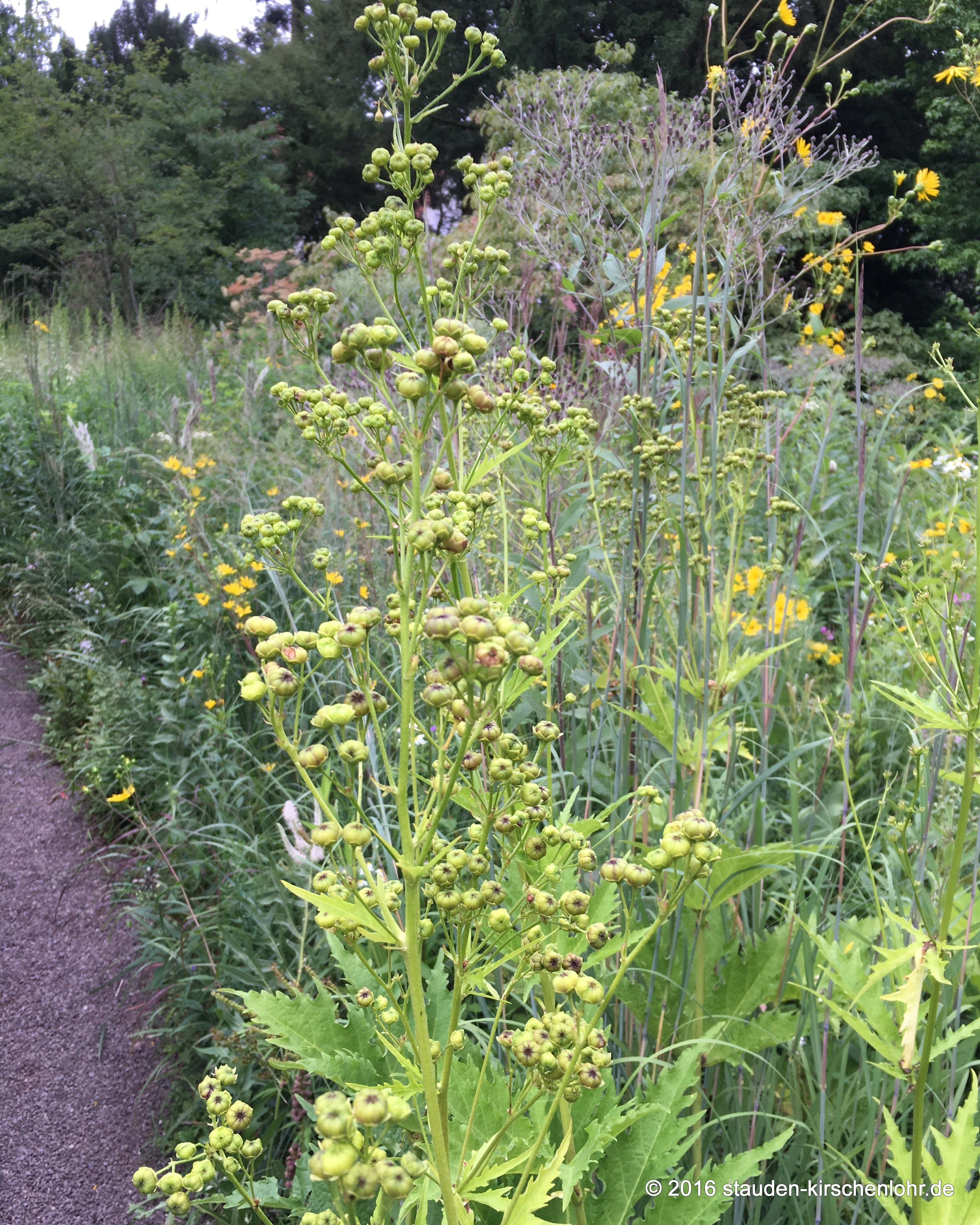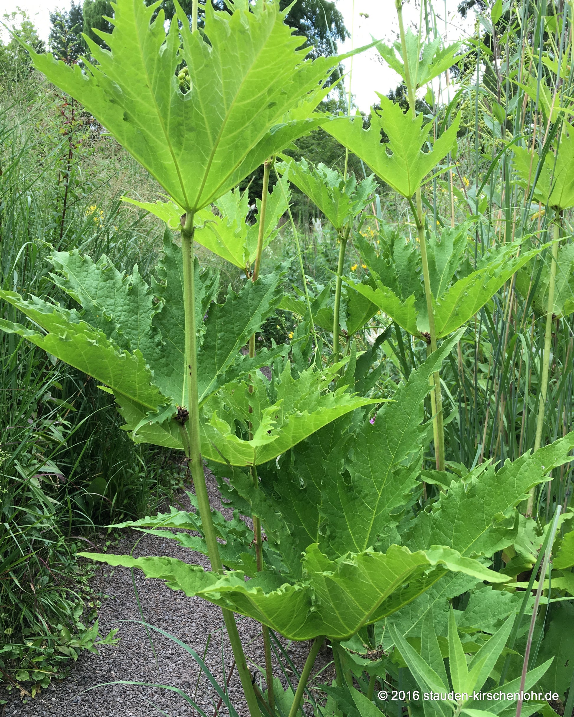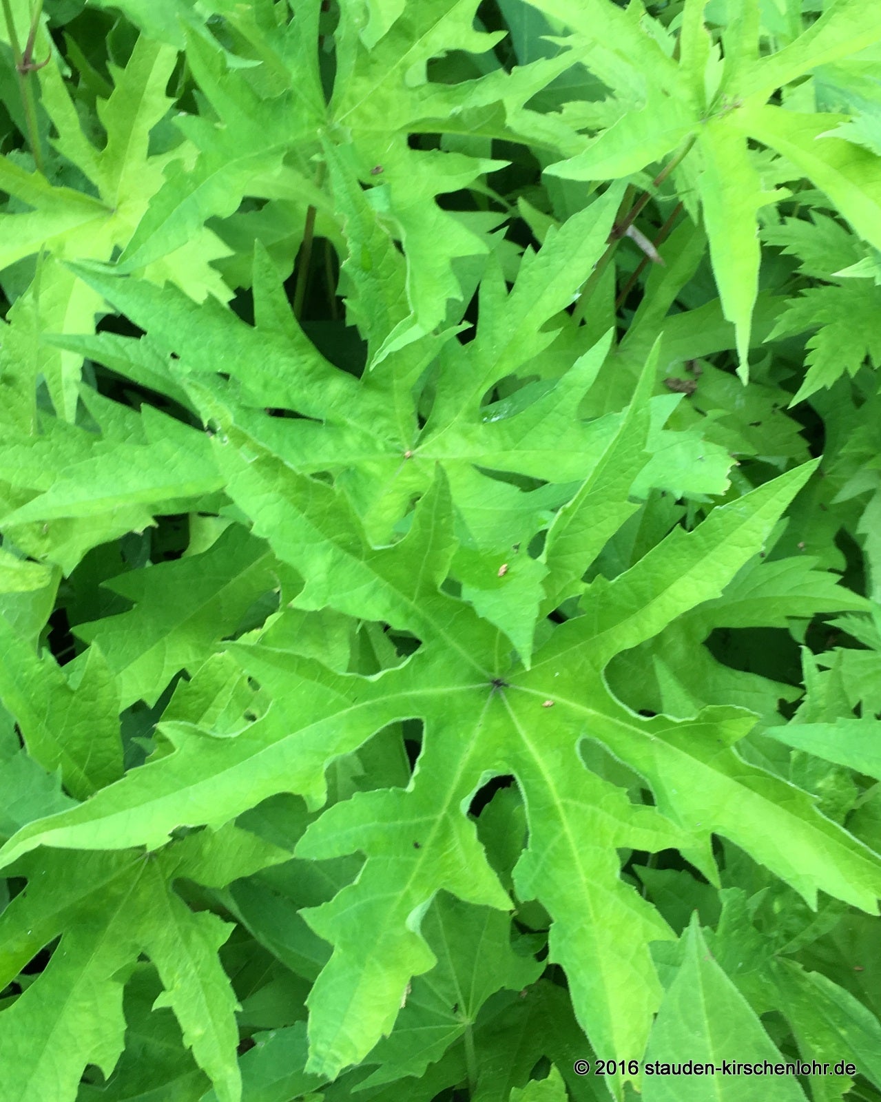 Kleine, weiße Malvenblüten. Blütenstand scheindoldig, achsel- bis endständig. Interessante, große, bis 11-fach gelappte, handförmige Blätter. Sommergrün.