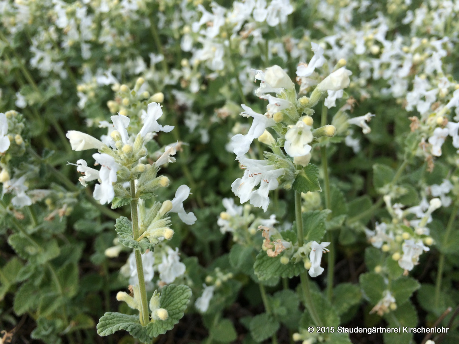Weiße Lippenblüten in einem traubigem Blütenstand. Graugrüne, ovale Blätter mit gekerbtem Blattrand. Kompakter Wuchs. Sommergün. syn. N. x faassenii 'S.'