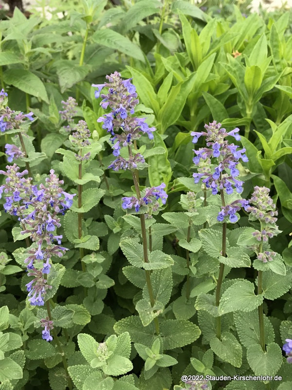 Lilablaue Lippenblüten in einem traubigem Blütenstand. Graugrüne, ovale Blätter mit gekerbtem Blattrand. Äußerst reichblütig. Gut wüchsig, standfest und absolut robust. Sommergün. syn. N. x faassenii 'S.'