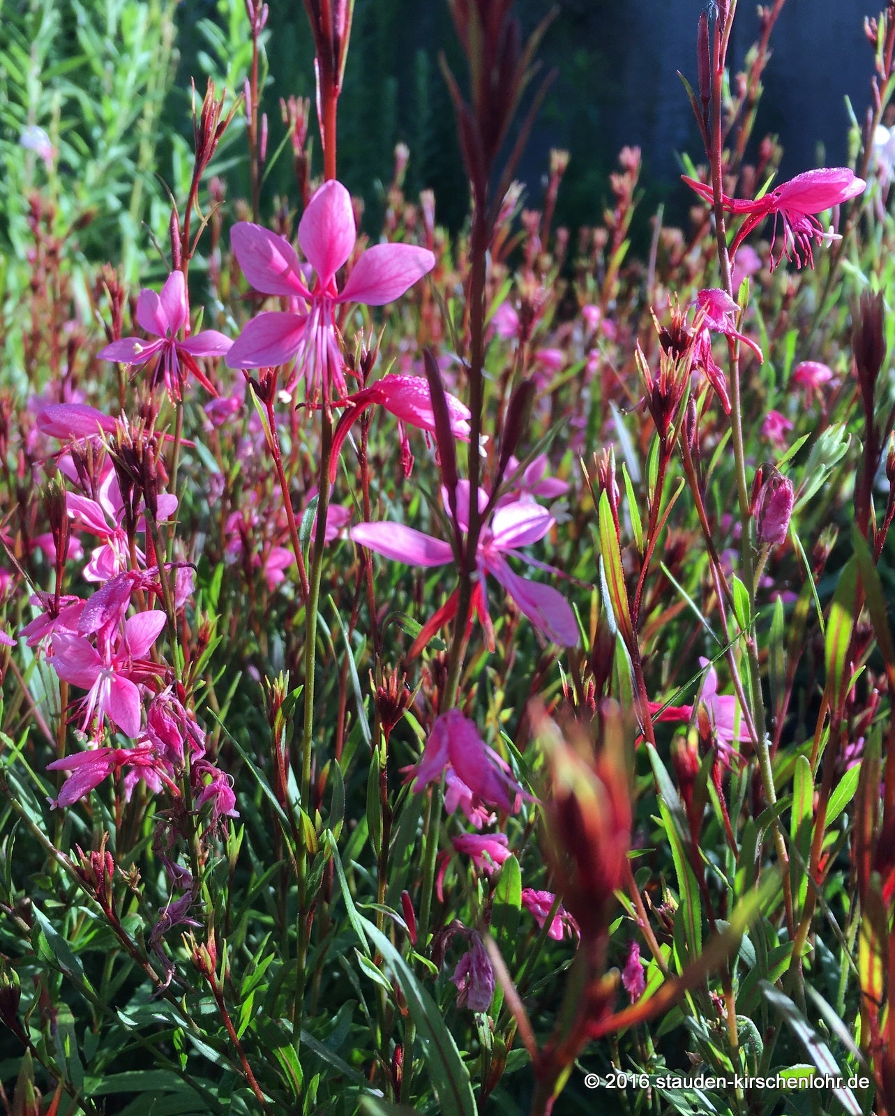Blüten rosa. Kompakte, aufrechtwachsende Sorte mit sehr guter Verzweigung. Schmales Laub. Toleriert keine Staunässe. Sommergrün. syn. Gaura lindheimeri 'Cherry Brandy' ®