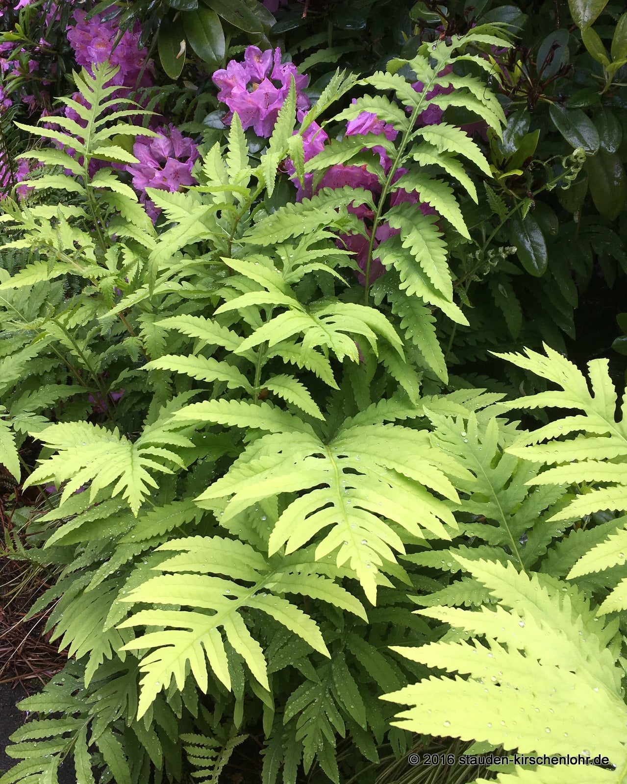 Grob gefiederte, hellgrüne Wedel mit gekerbtem Rand auf kriechendem Rhizom. Bildet Ausläufer. Liebt frische bis feuchte Böden. Sommergün.