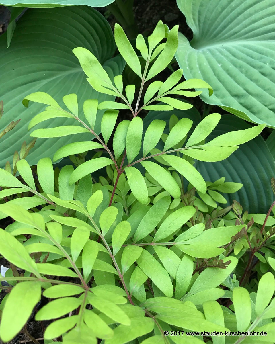 Hellgrüne, zweifach gefiederte Wedel. Die fiedern sind auffällig lanzettlich. Liebt humose, feuchte Böden. Sommergrün.