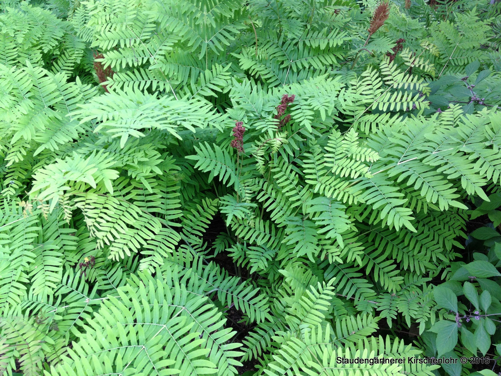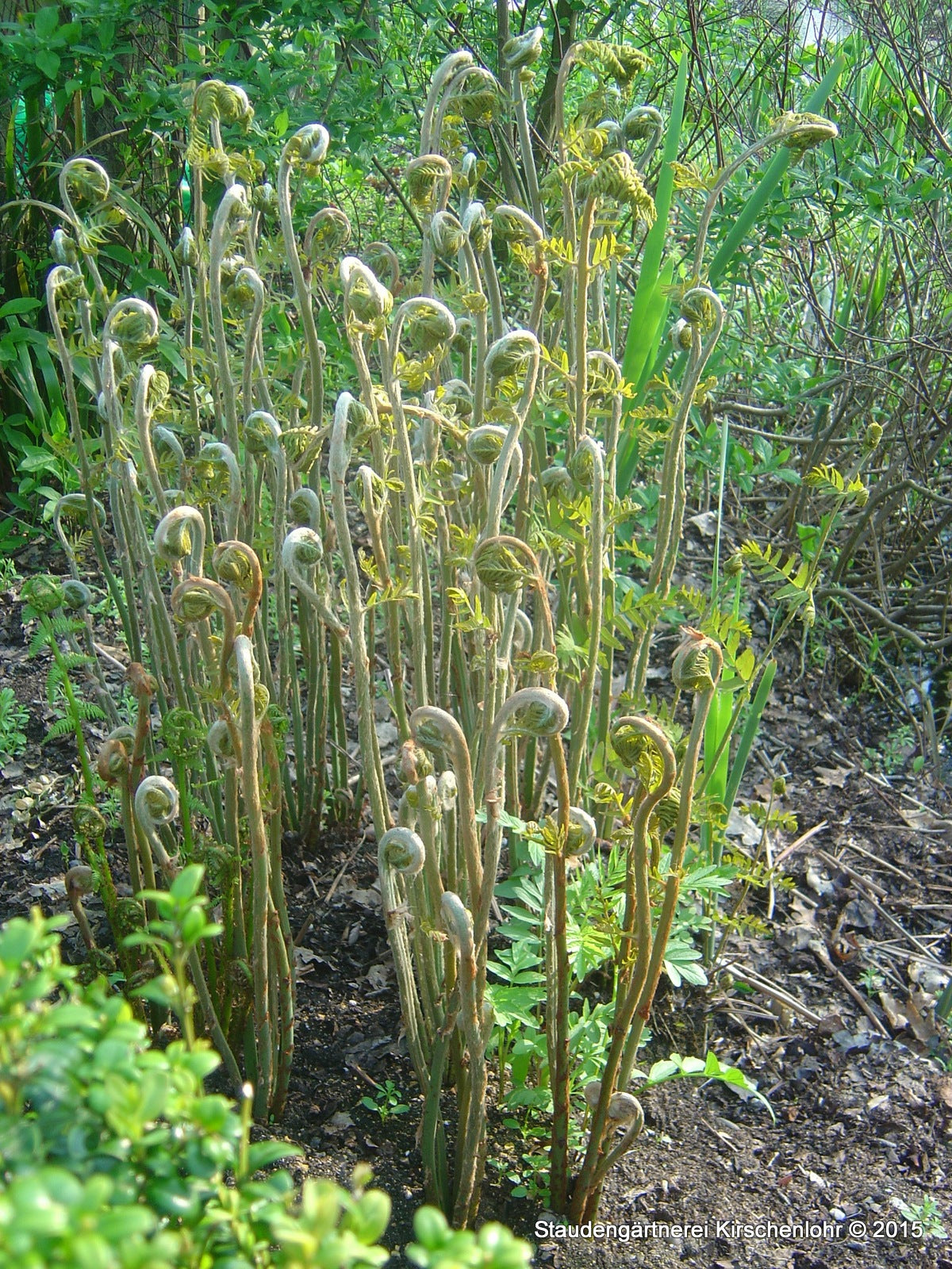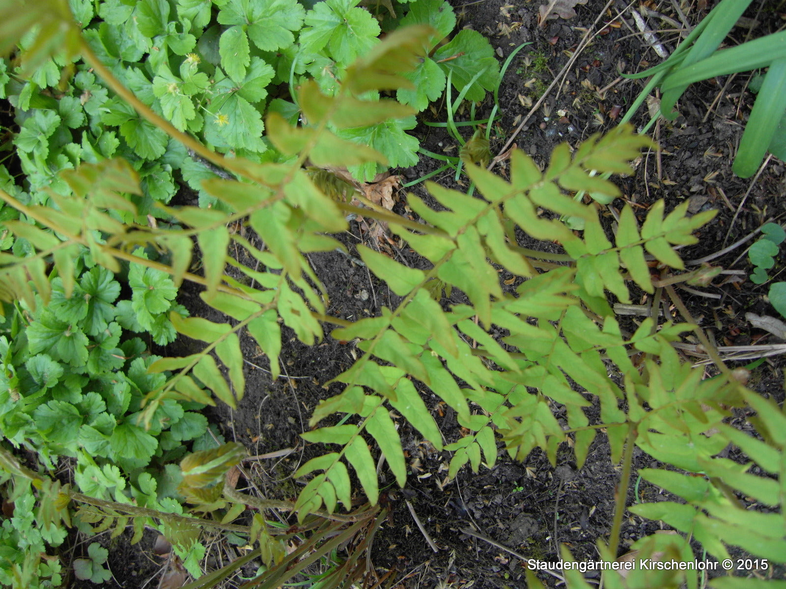 Ein mächtiger sommergrüner Farn. Hellgrüne, zweifach gefiederte Wedel, mit leicht rötlichem, behaarten Austrieb. Liebt humose, feuchte Böden.