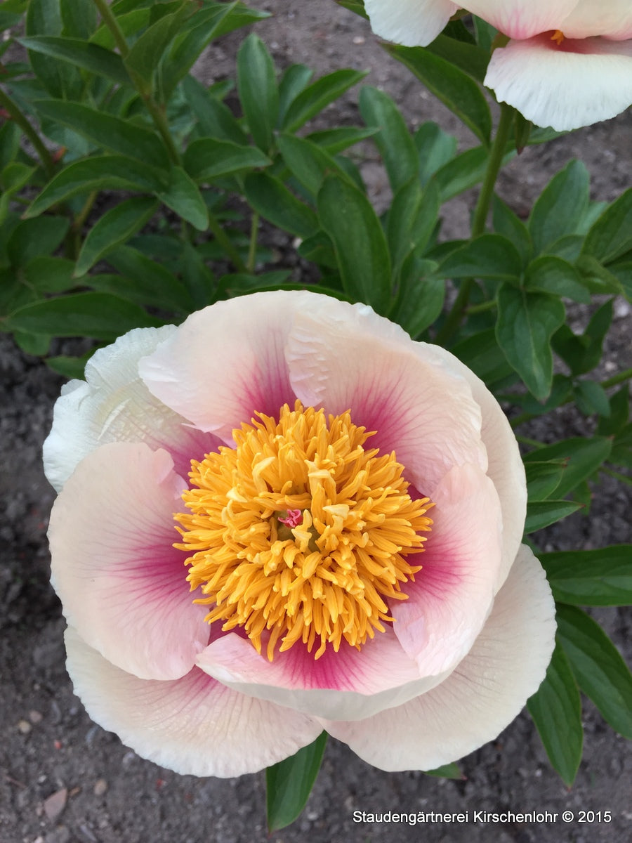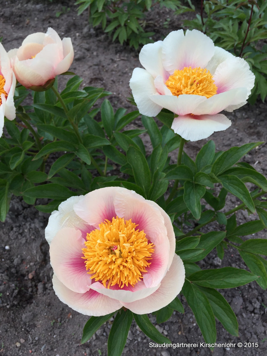 Einfache zartrosa Blütenschalen mit wunderschönen himbeerroten Basalflecken. Seltene Prof. A. P. Saunders Züchtung (P. macrophylla x P. mlokosewitschii) x P. officinalis)).
