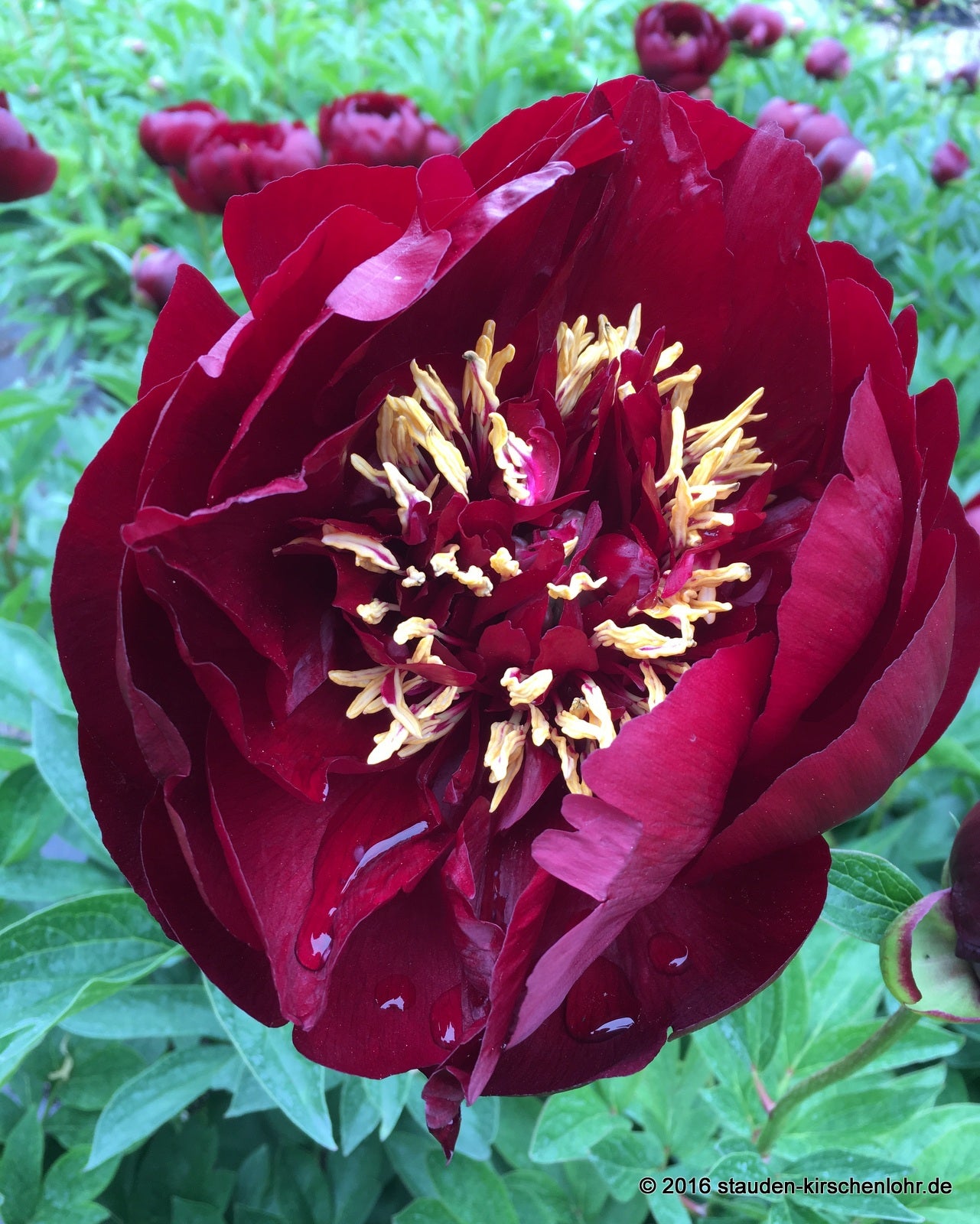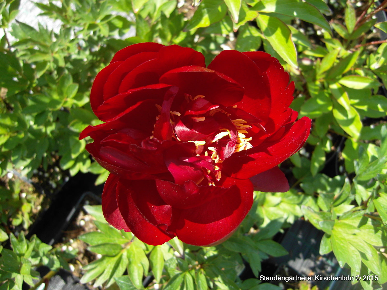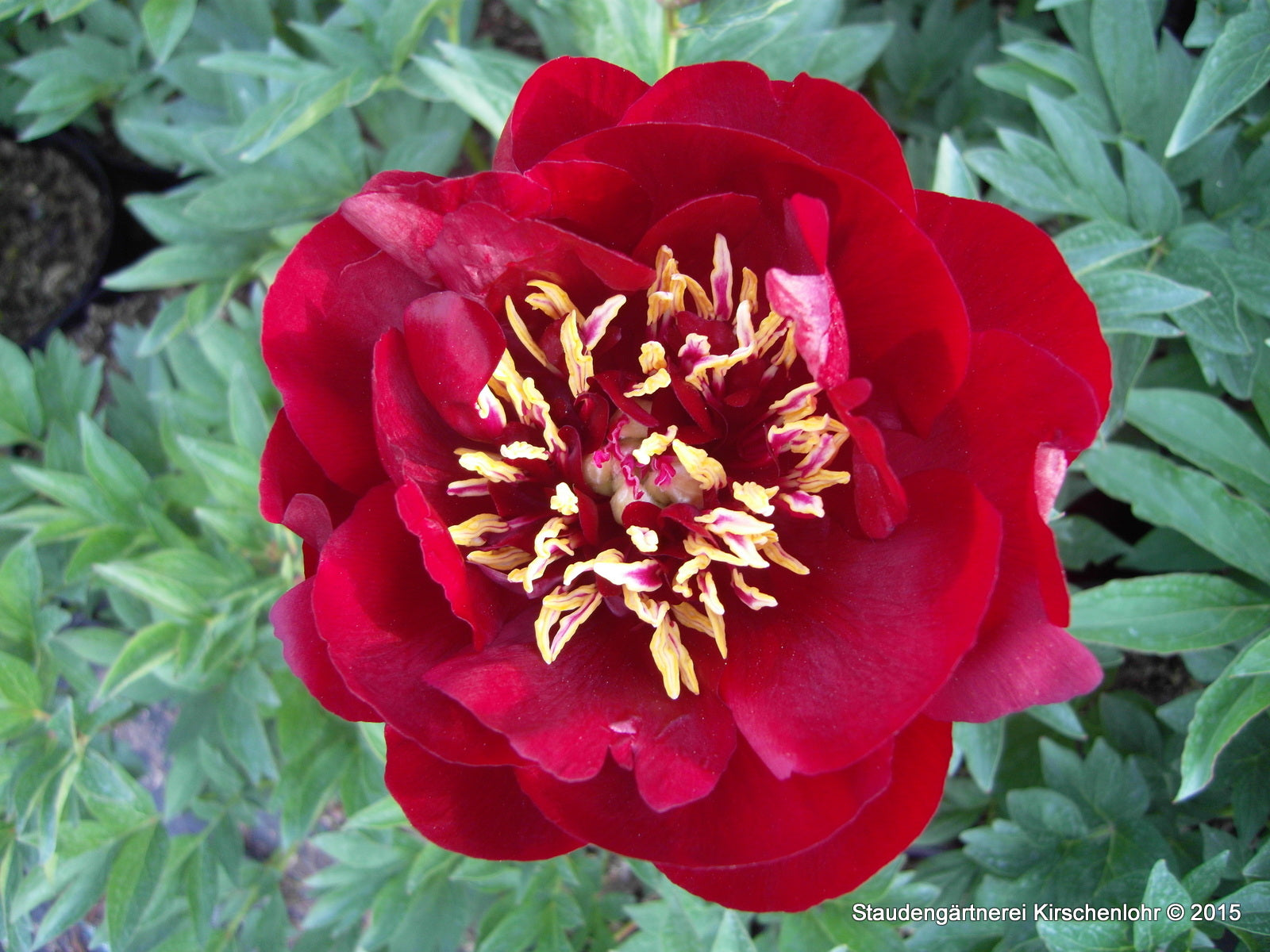 Halbgefüllte, samtige, dunkel braunrote Blüten mittlerer Größe. Die blassgelben Staubgefäße weisen ab und zu Blütenblätter auf. Dunkelgrünes Laub.