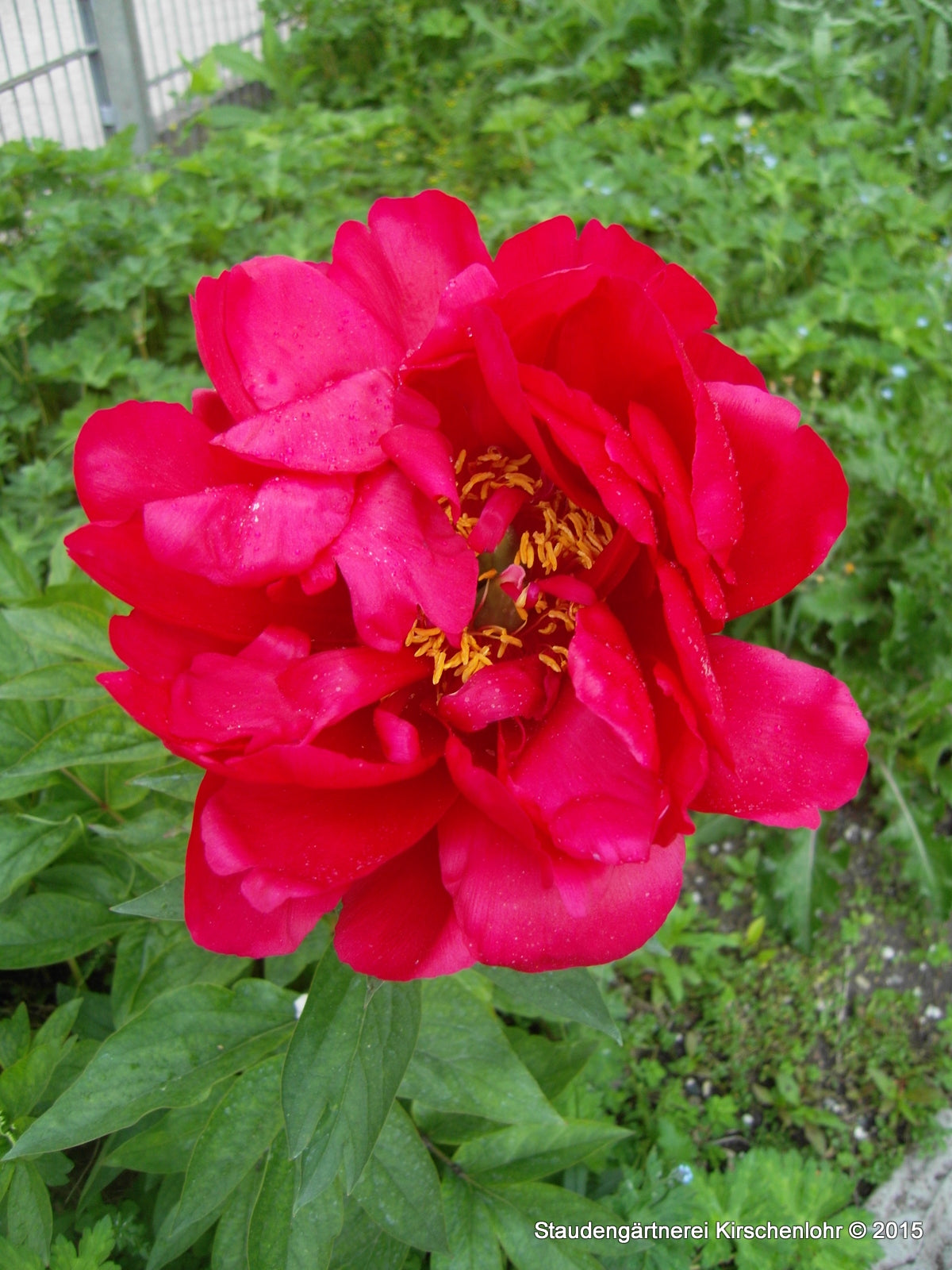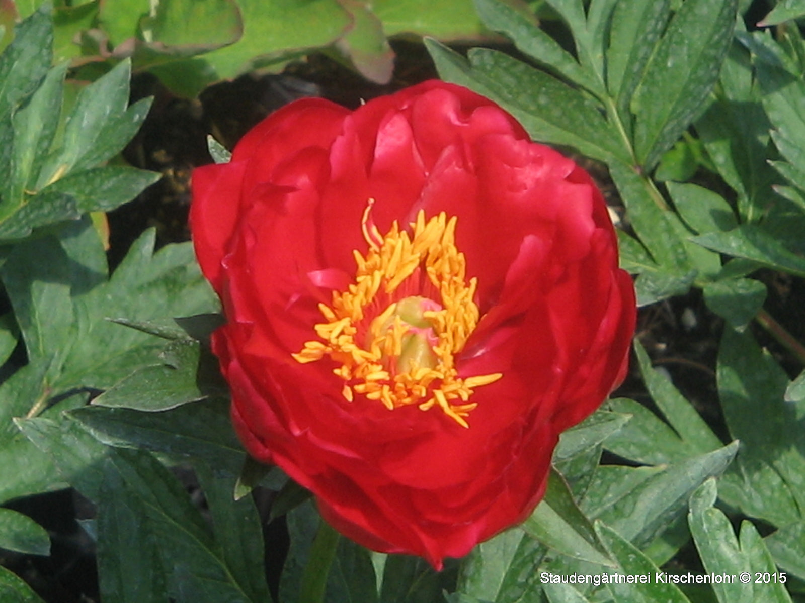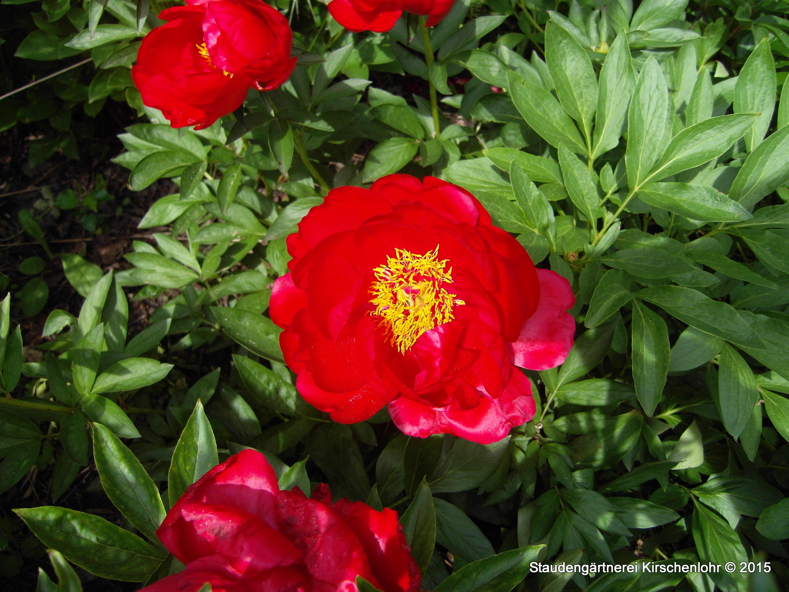 Halbgefüllte hellrote bis kirschrote, recht große Blüten mit goldgelben Staubgefäßen. Starke Stängel. Sehr selten angebotene Sorte. Rarität!