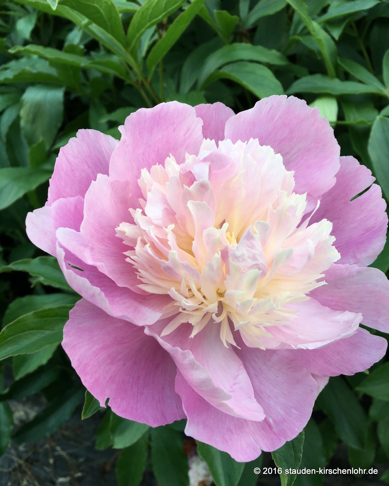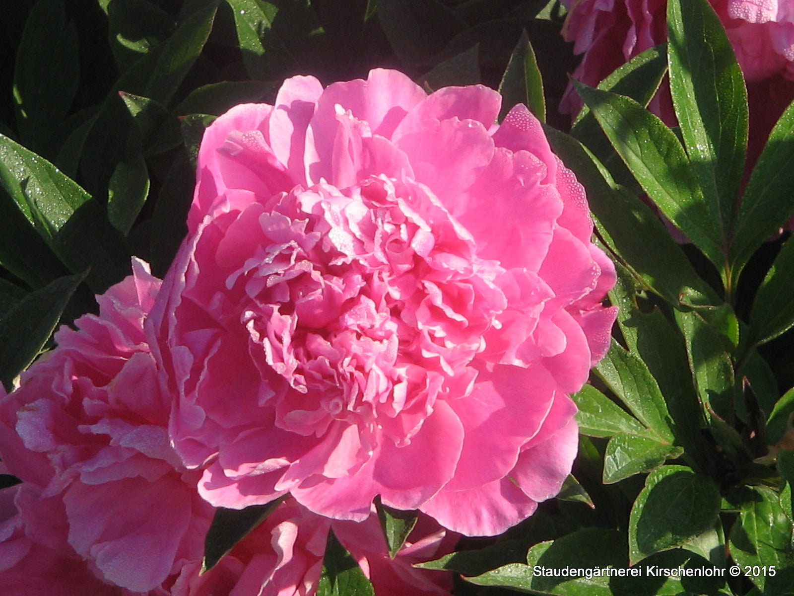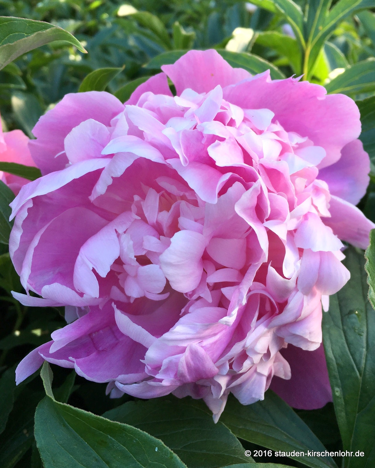 Dicht gefüllte, kräftig lilarosa Blüten mit breiten, schalenförmigen äußeren Petalen und mittig, kugel- förmig angeordnete kleine Petalen. Seidiger Glanz.