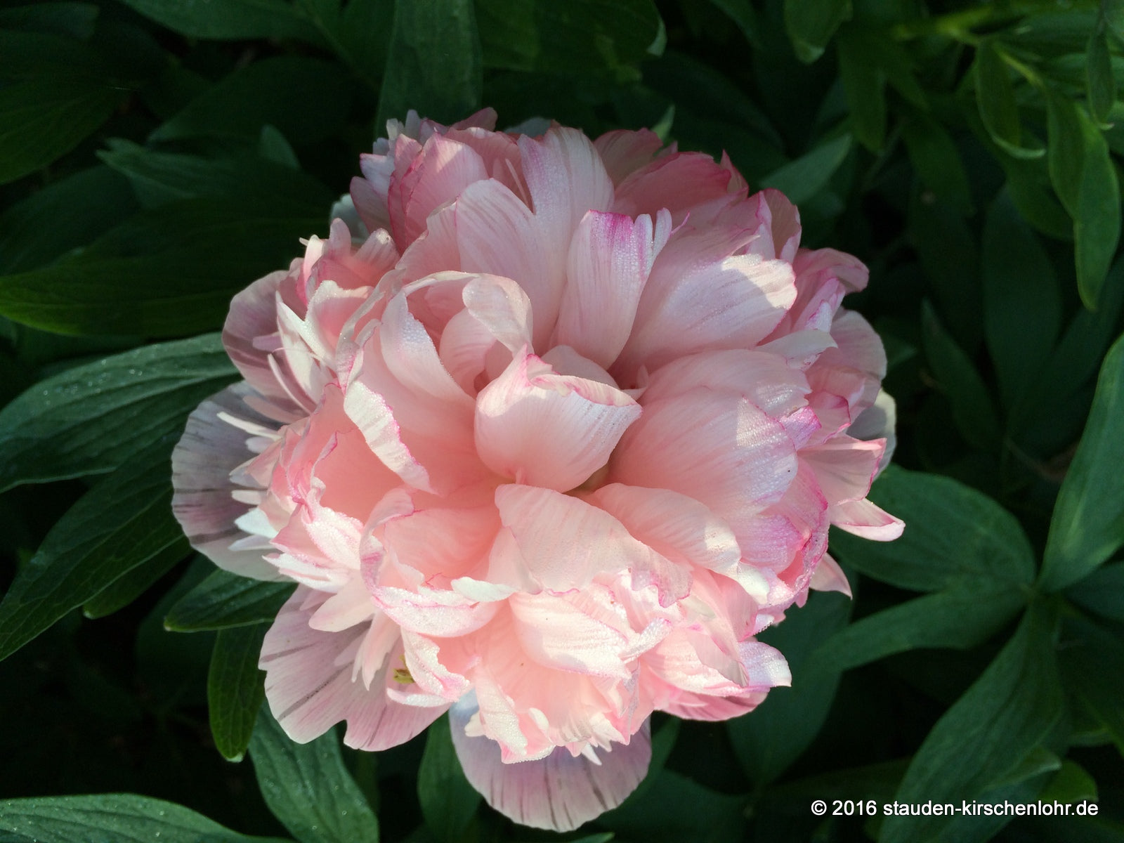 Gefüllte hellrosa Blüten mit durchscheinender (eisiger) Wirkung. Dunkelgrüne, mehrteilige Blätter. Die einzelnen Segmente sind oval bis elliptisch.