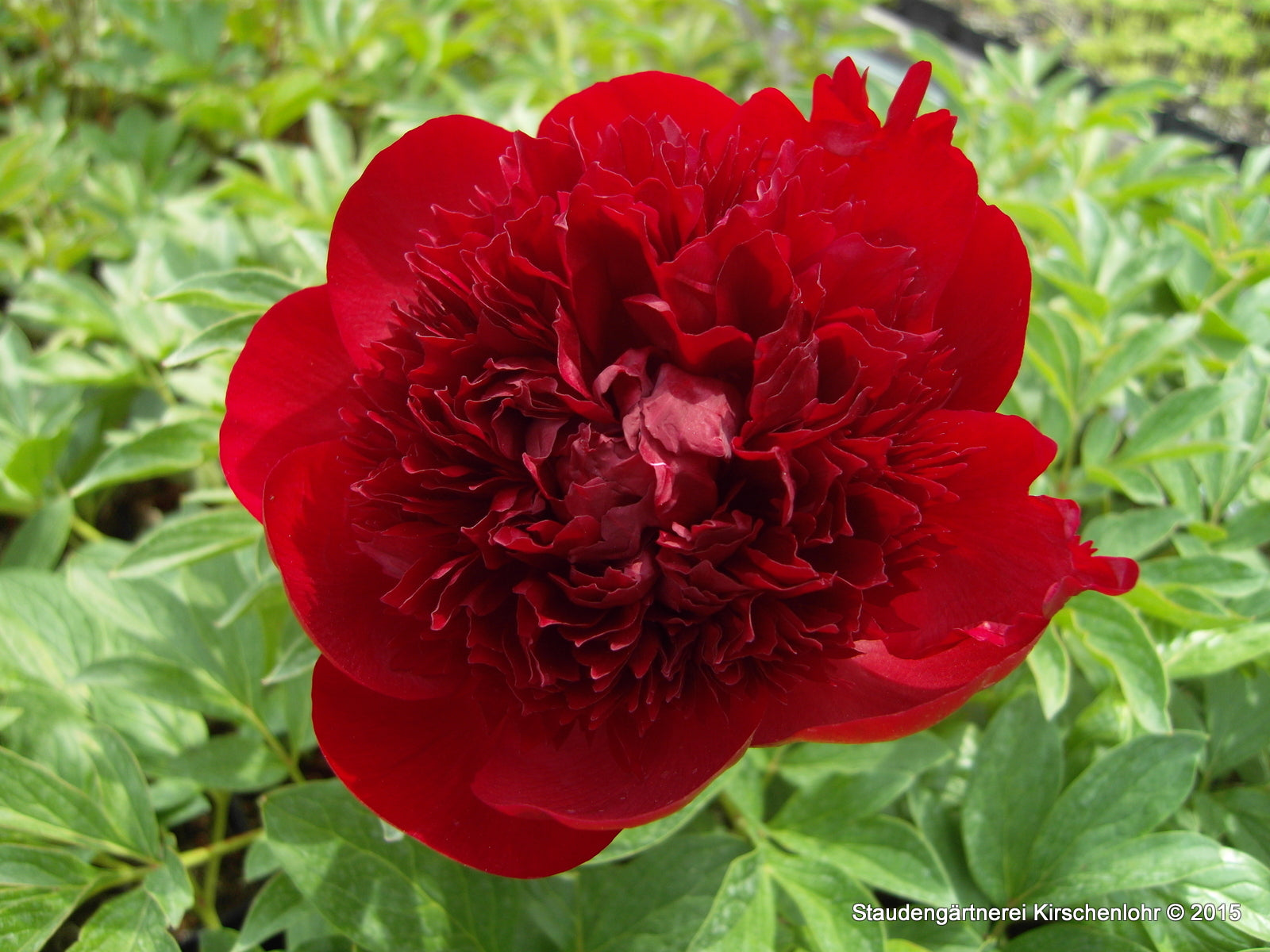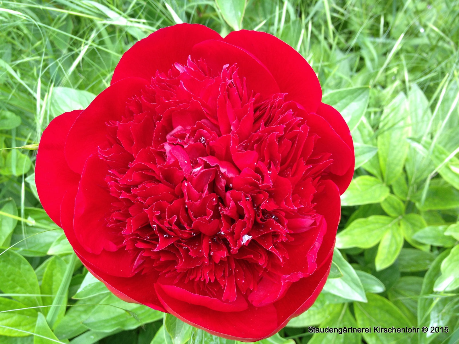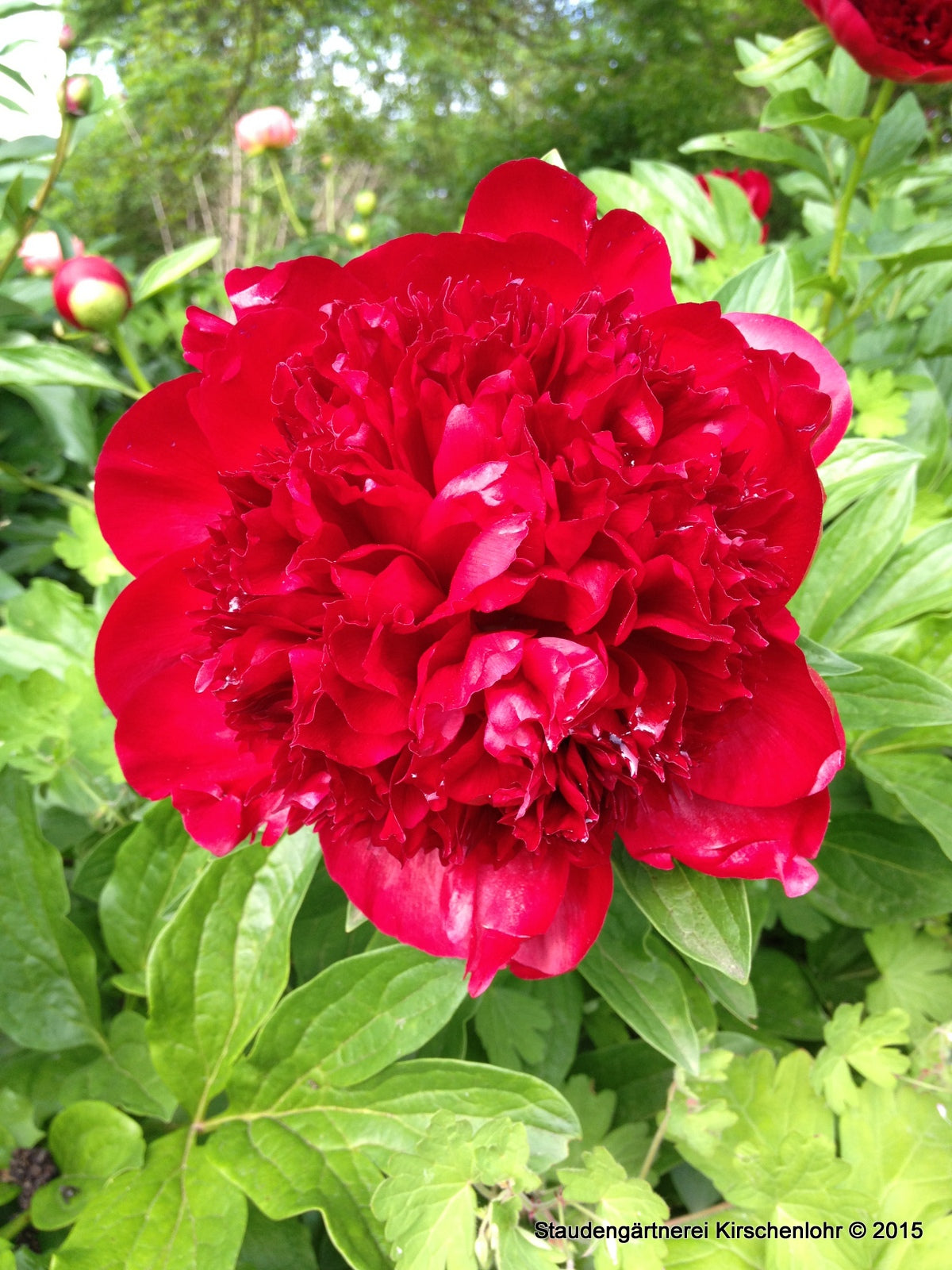 Eine wirklich tolle Sorte mit Riesenknospen und wunderbar geformten, dichtgefüllten, bombenförmigen, dunkelroten Blüten. Starke Stängel. Duftend.