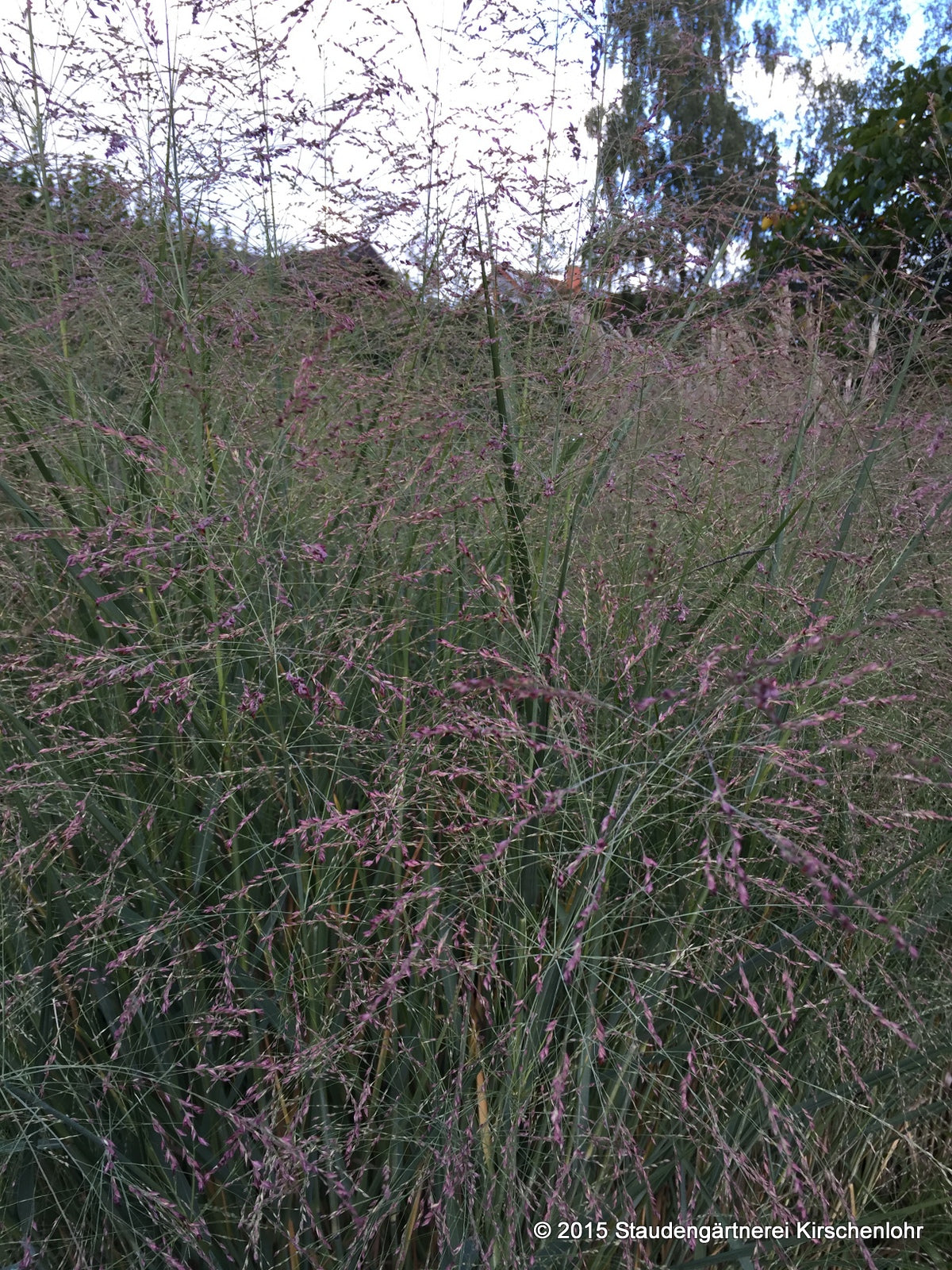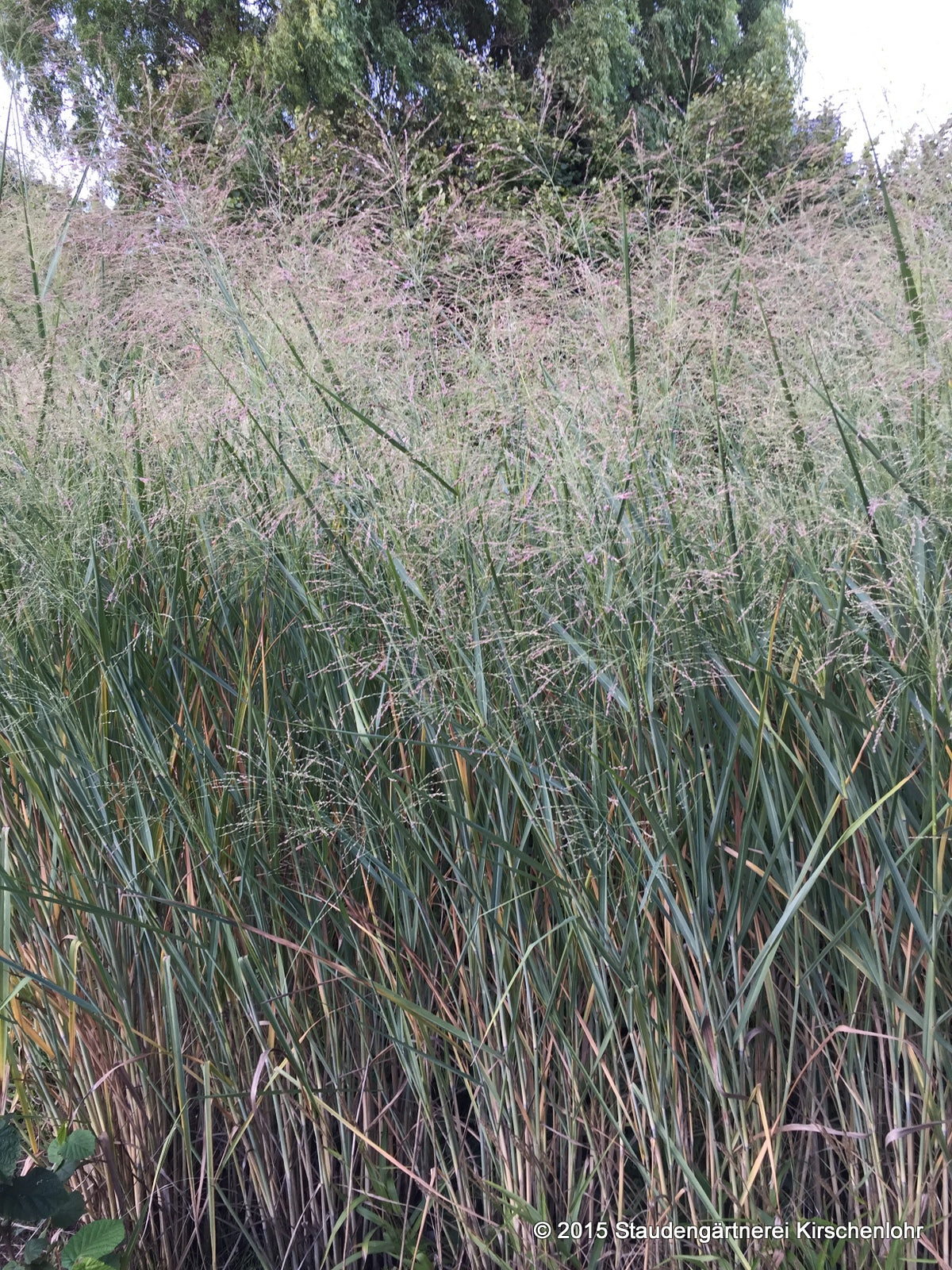 Straff aufrechte, vielästige, rispige, beige Blütenstände. Nach oben gerichtete, breite Blattspreiten. Gigantischer, trichterförmiger Wuchs. Gelbe Herbstfärbung.