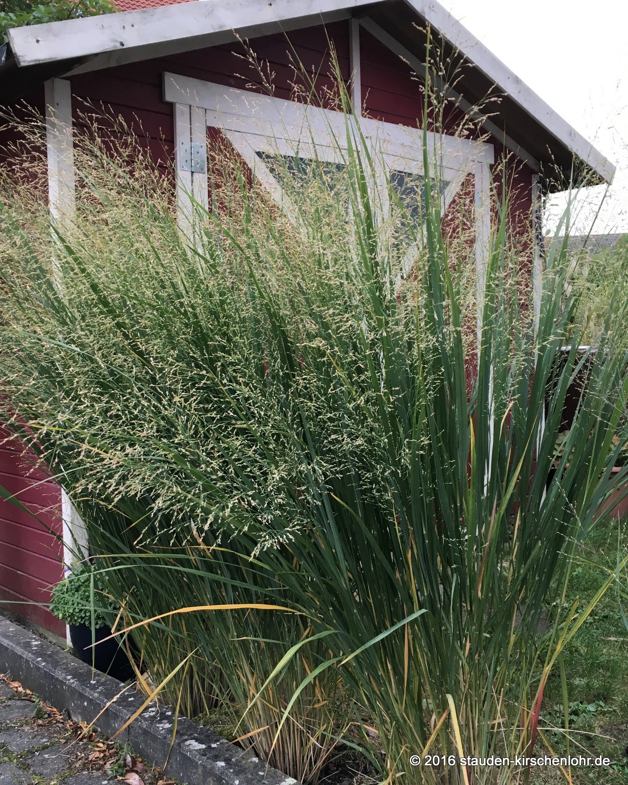 Blütenstände lockerrispig, braungrün. Lineales, spitz zulaufendes Laub an straff aufrechten Stängeln. Auffallende, fast säulenhafte Gestalt. Graugrünes Laub mit gelber Herbstfärbung. Standfestigkeit hervorragend!