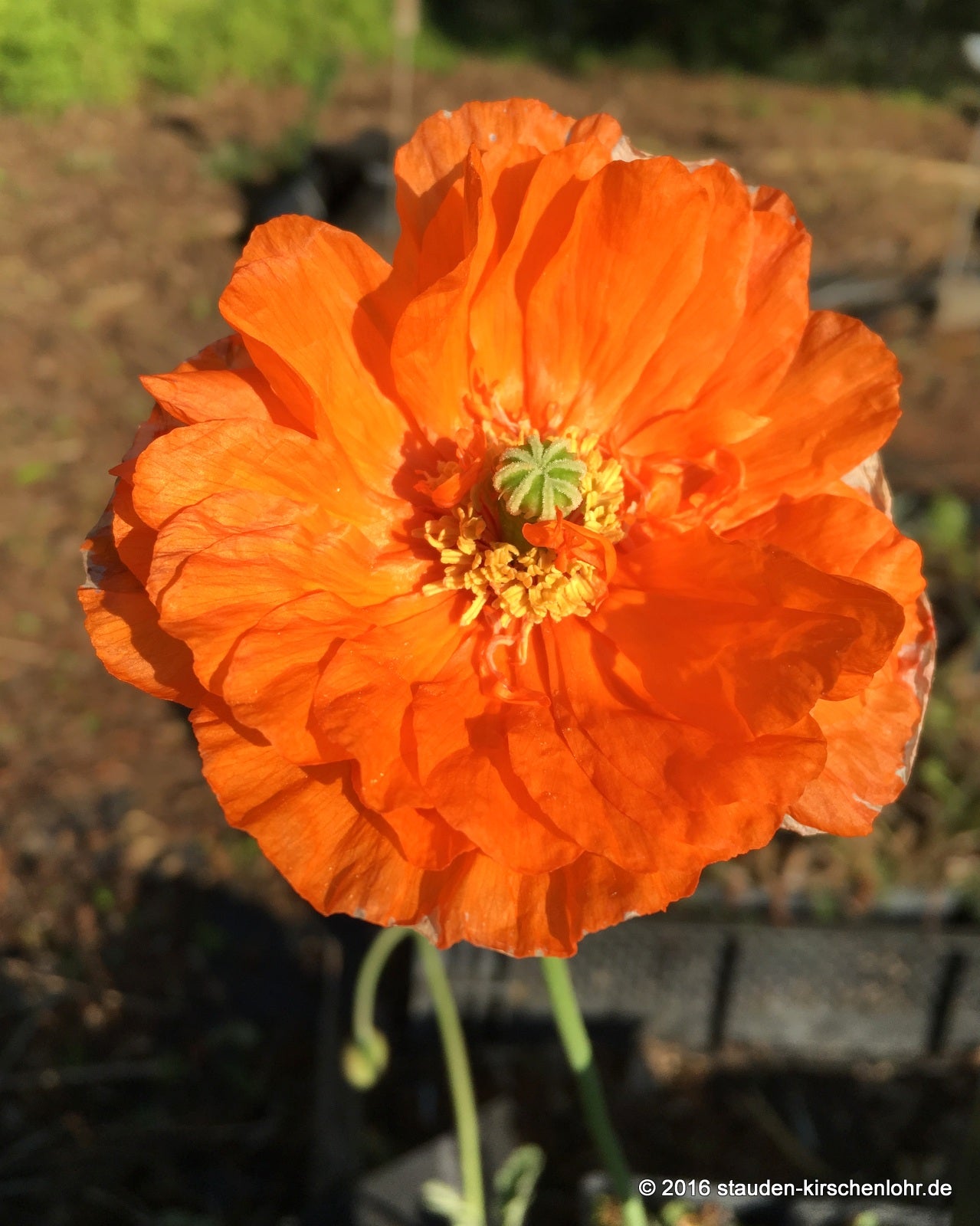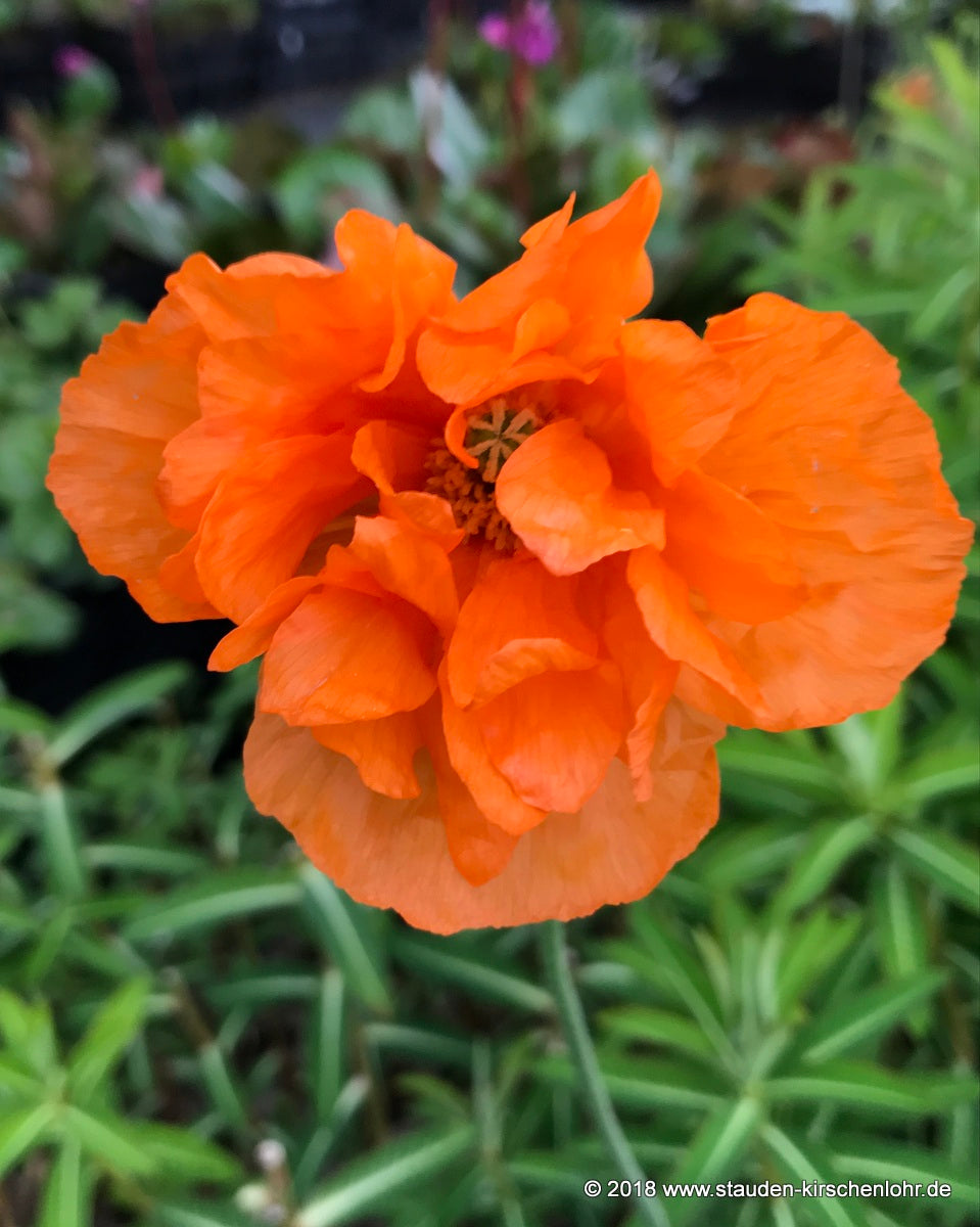 Hellorange Schalenblüten. Blüten fast immer, halbgefüllt, auf dünnen, fein behaarten Stängeln. Lanzettliche, mattgrüne Blätter mit gesägtem Blattrand. Heimat im Kaukasus und in Armenien.