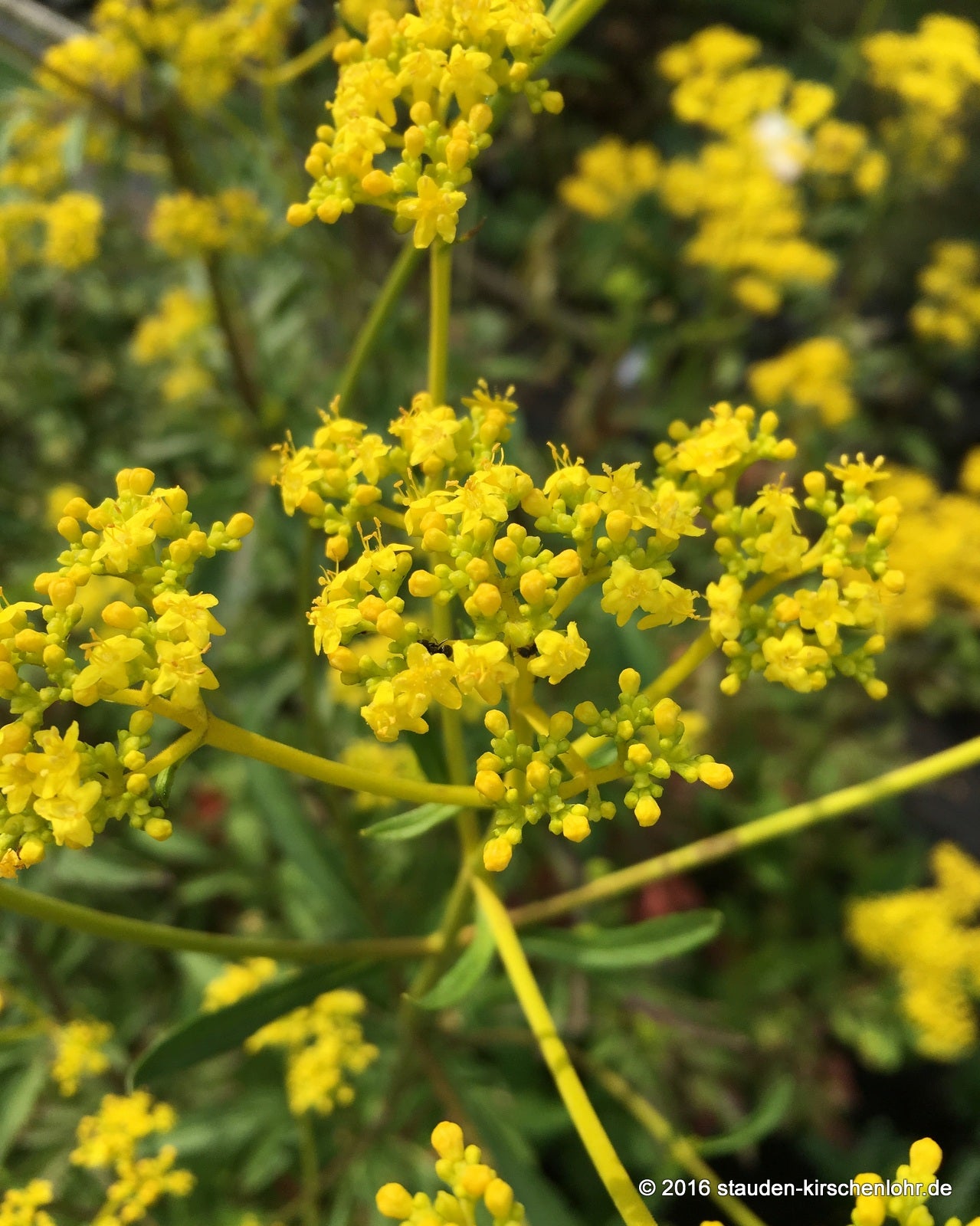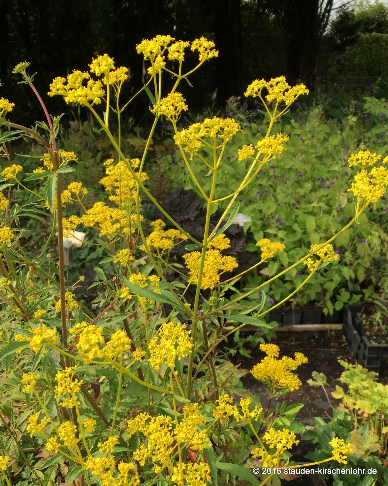 An schlanken Stängeln mit lockeren, verzweigten Trugdolden, sitzen gelbe Einzelblütchen. Wiesenpflanze aus China, Japan, Korea und Taiwan. Geteilte hellgrüne Blätter.