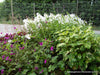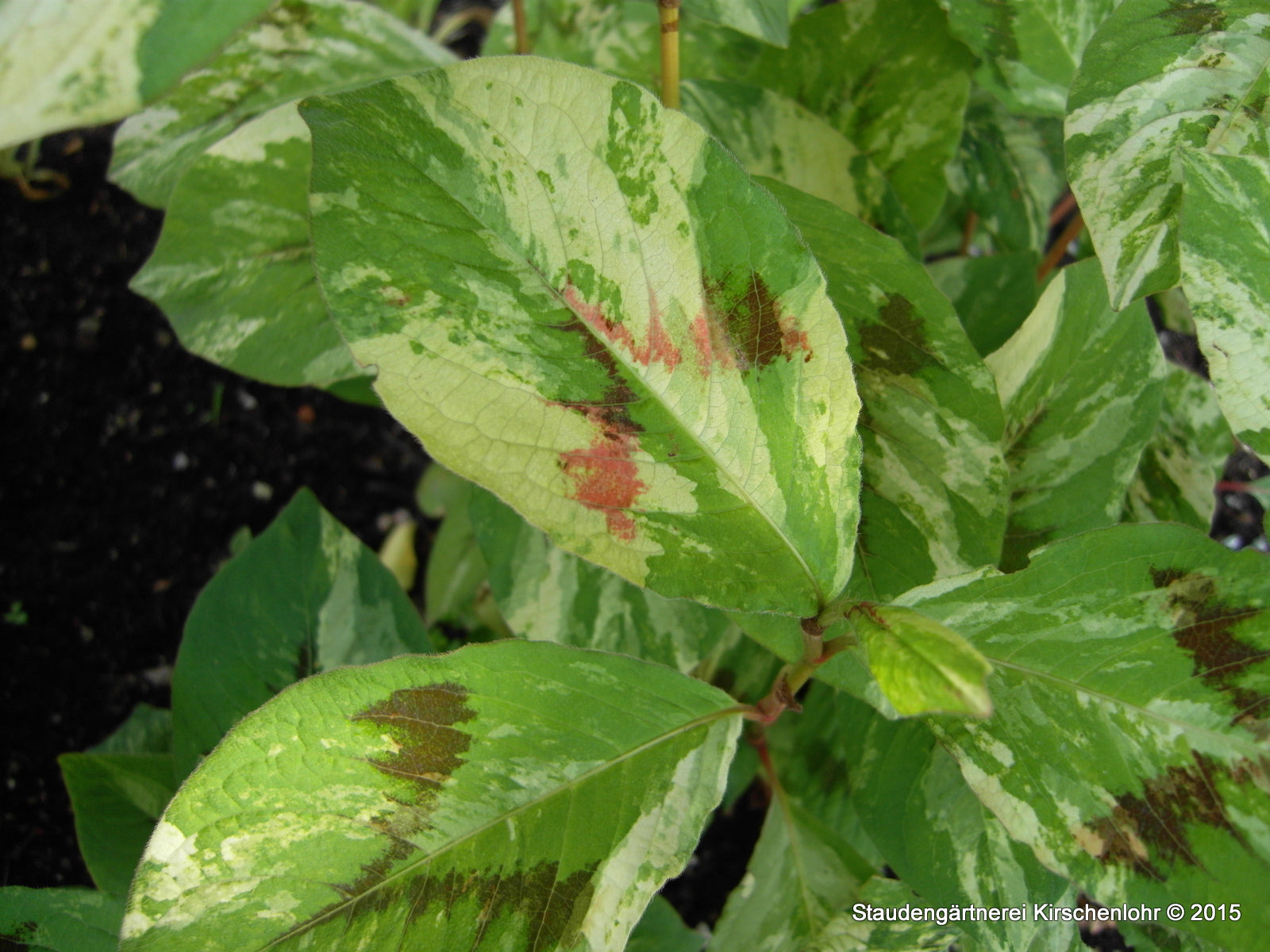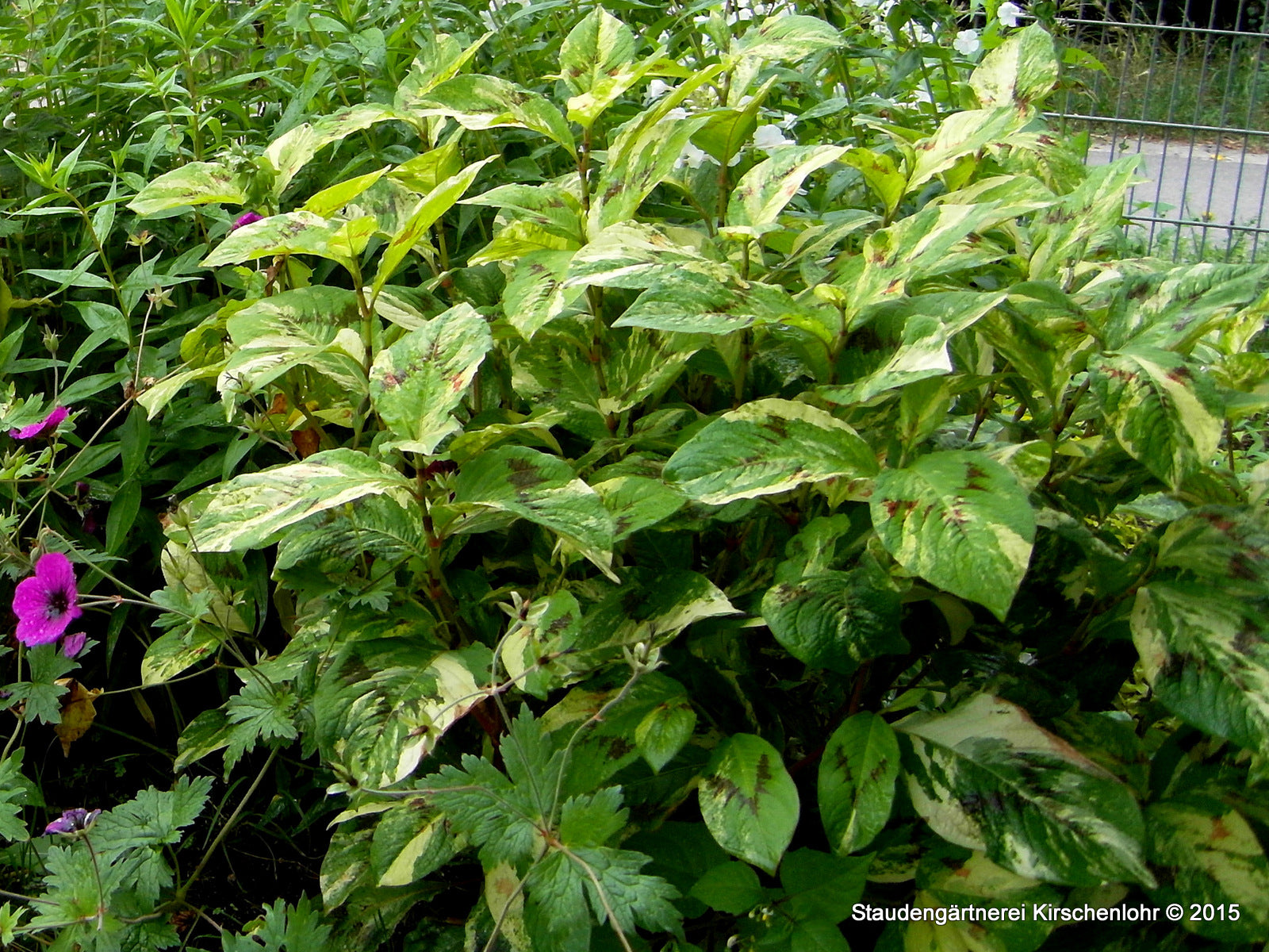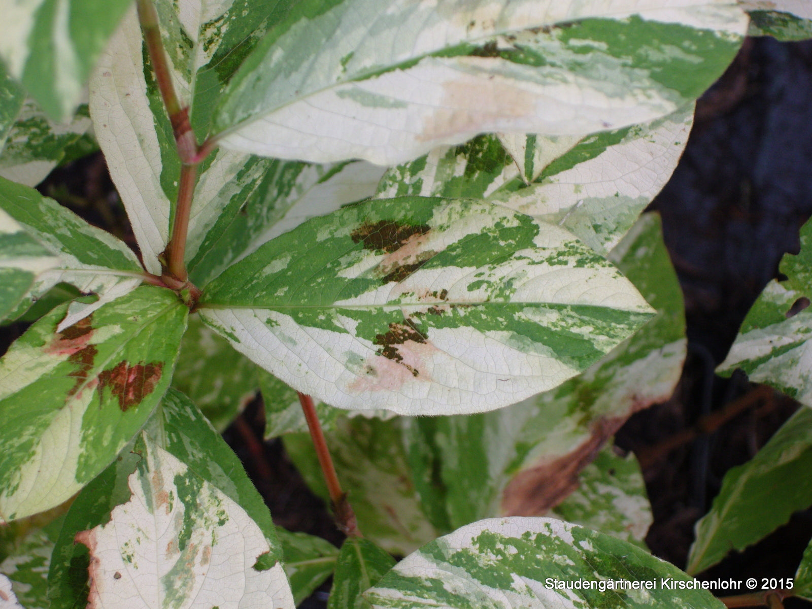 Locker aufgereihte, leuchtend rote Blütchen sind wie an einem aufrechten Faden aufgereiht. V-förmig gezeichnete, ovale Blätter mit auffälliger, unregelmäßiger, cremegelber Panschierung.
