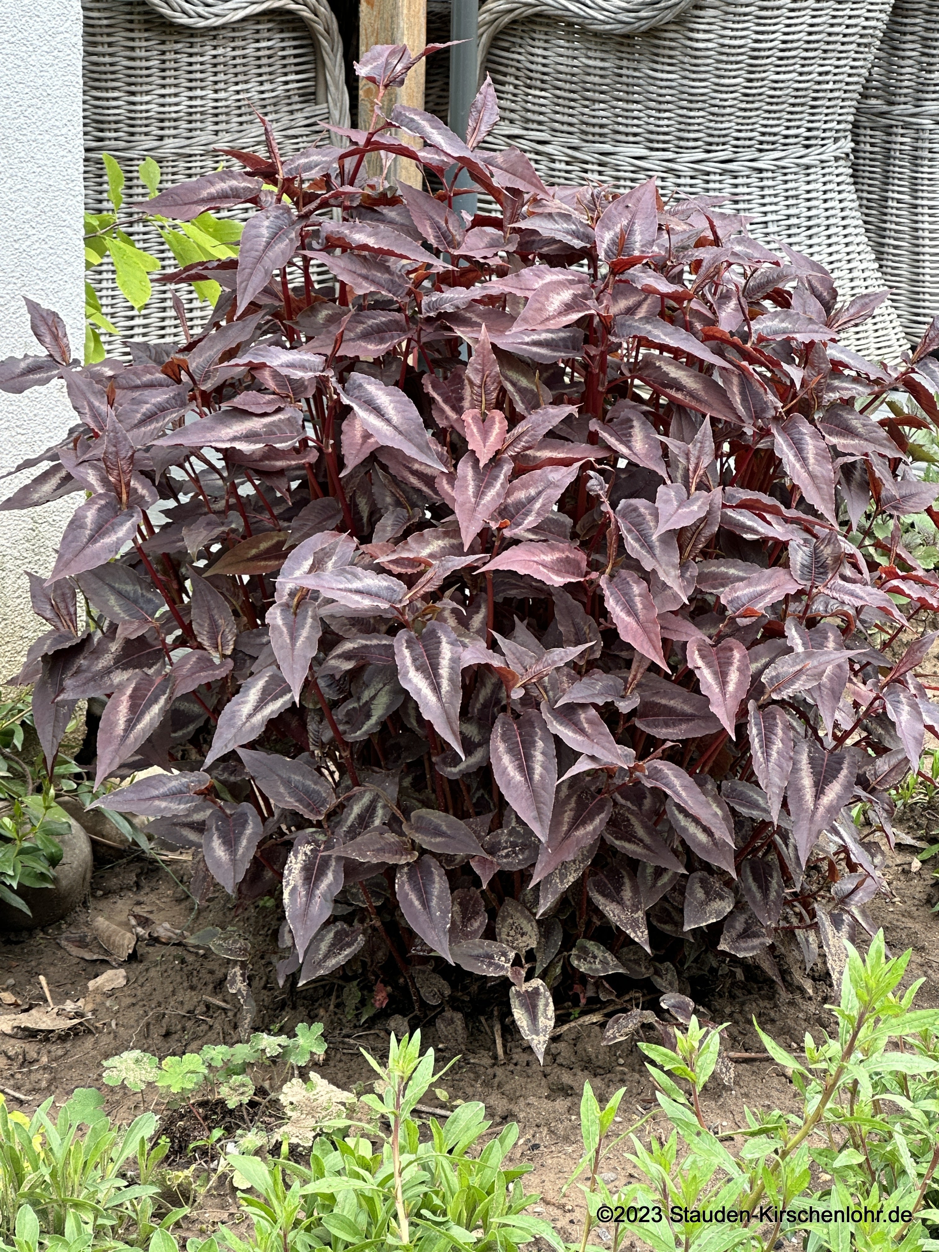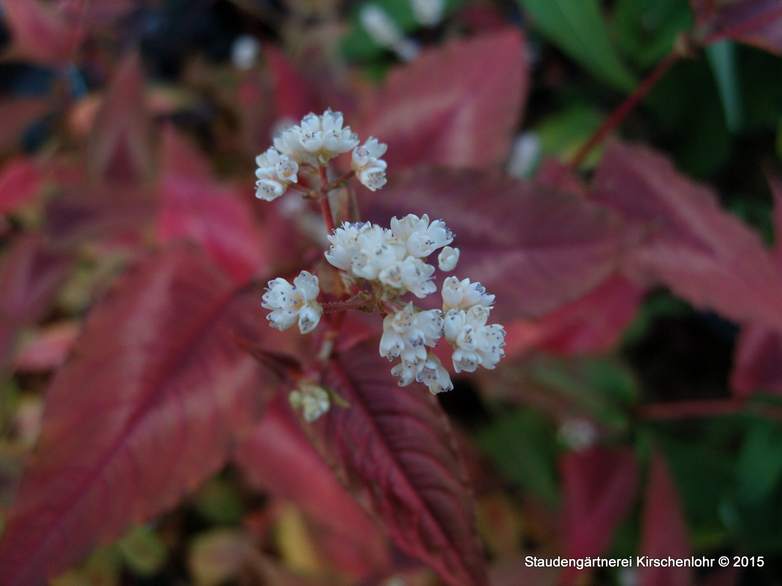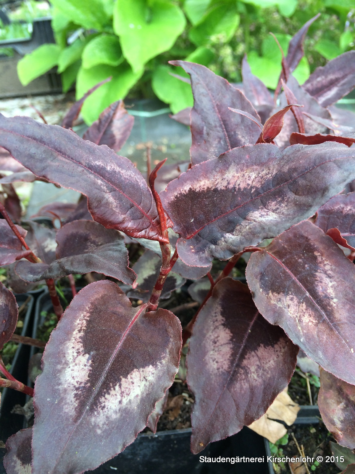Weiße, kronröhrige Blüten in einem rispenntraubigem Blütenstand. Wunderschöne purpurrote, lanzettliche Blätter mit v-förmiger, silbriggrauer Zeichnung. Sommergrün. syn. Polygonum m. 'R. D.' ®