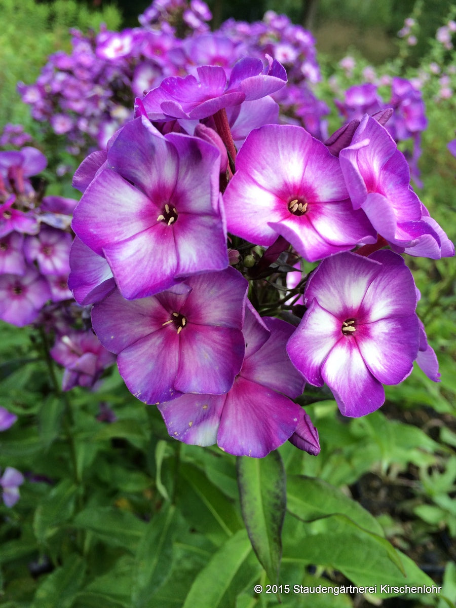 Lila Blüten mit sehr großem, weißen Auge und rötlicher Blütenröhre. Große Einzelblüten in doldentraubiger Blütenrispe. Dunkelgrüne Blätter und Stiele, gesundes Laub und starke Stiele.