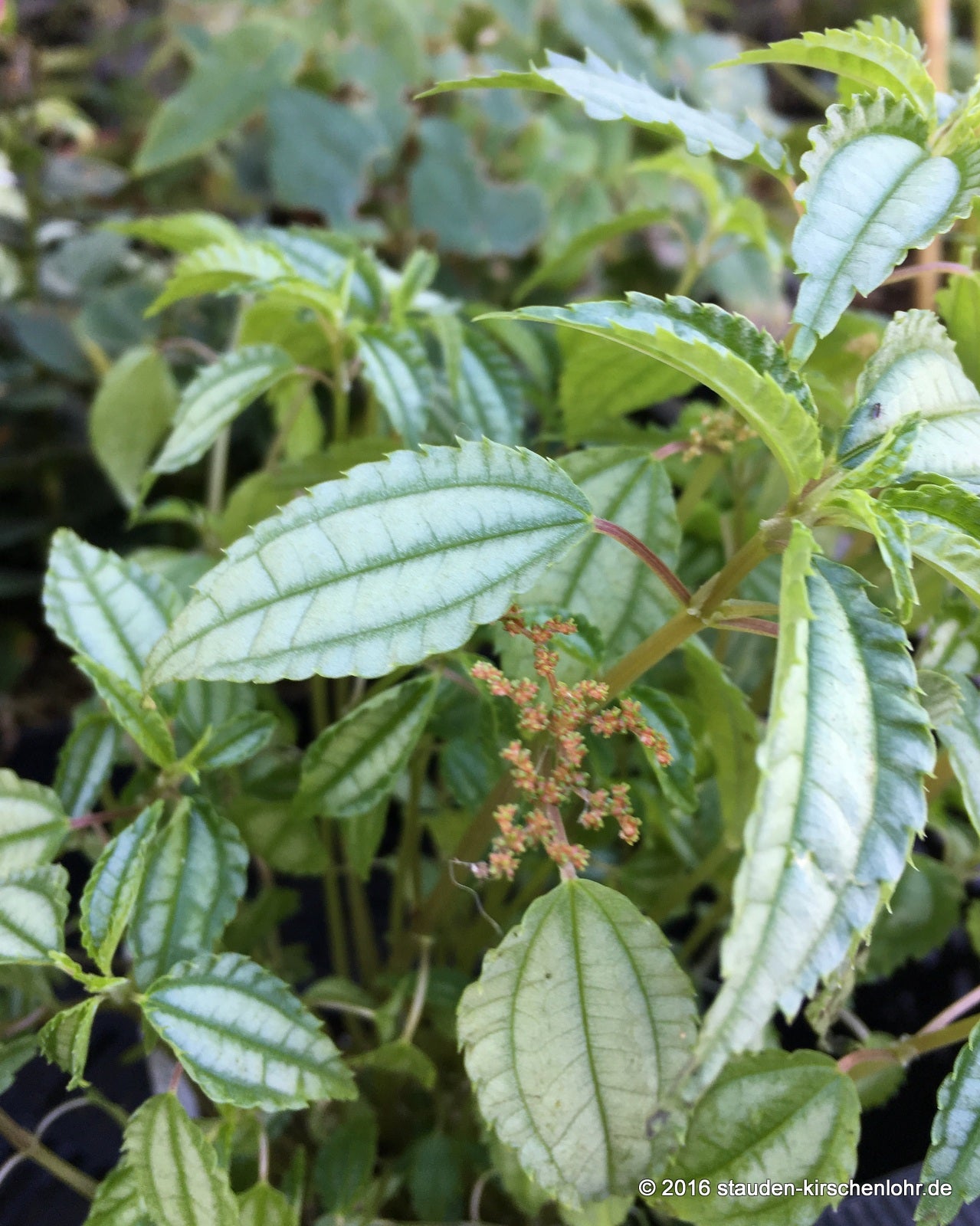 Grüne Blüten in Trauben. Elliptische Blätter mit gesägtem Blattrand. Helle, silbergraue Zeichnung zwischen den Hauptadern der Blätter. Sammlung aus China.