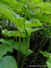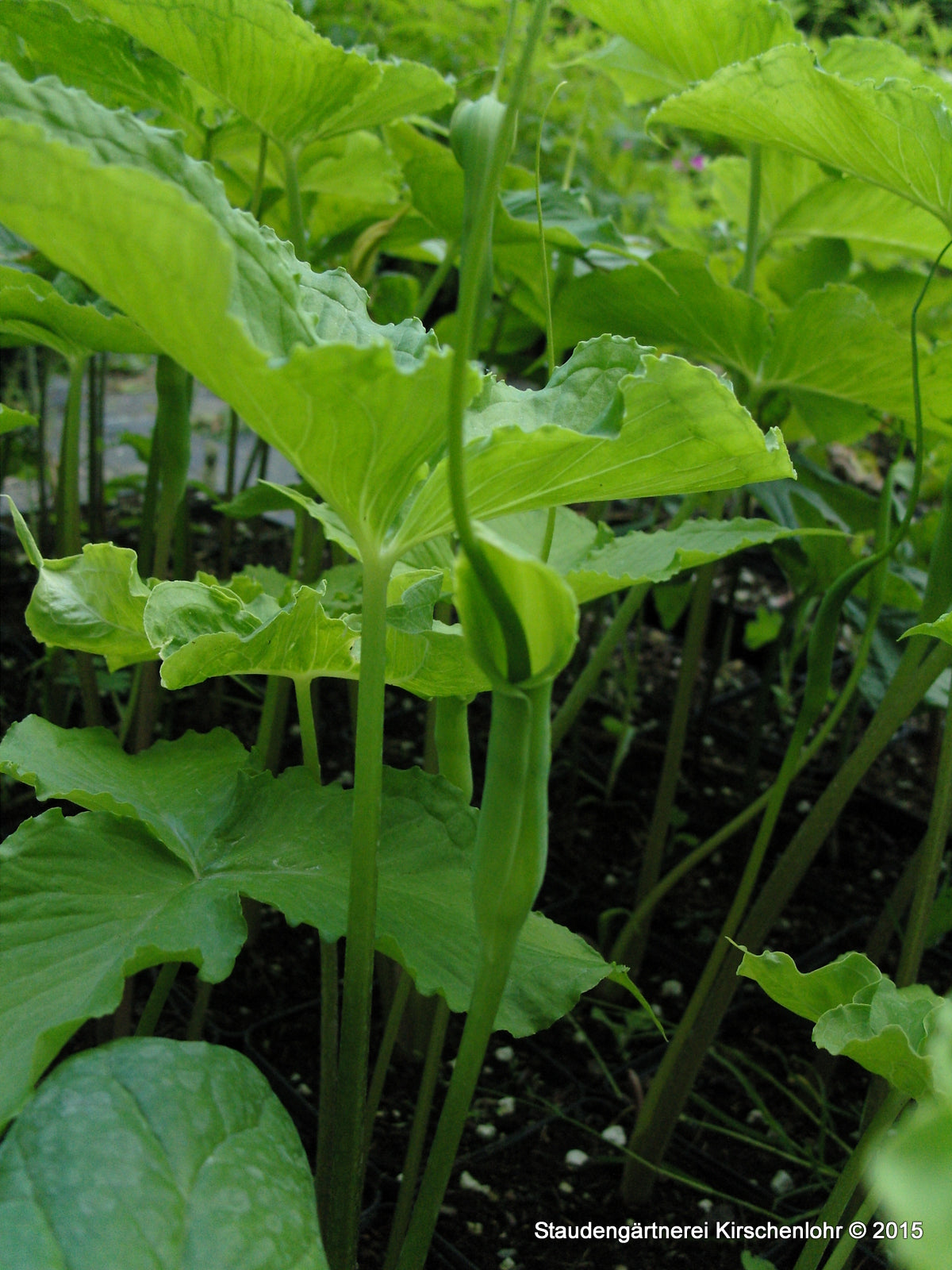 Dunklen bis hellgrünen, dreigliedrige, breite Blättern. Diese stehen aufrechten Blattstielen. Schmale, gelblich-grünen Spatha mit einem langen, gelben Spadix. Sommergrün.