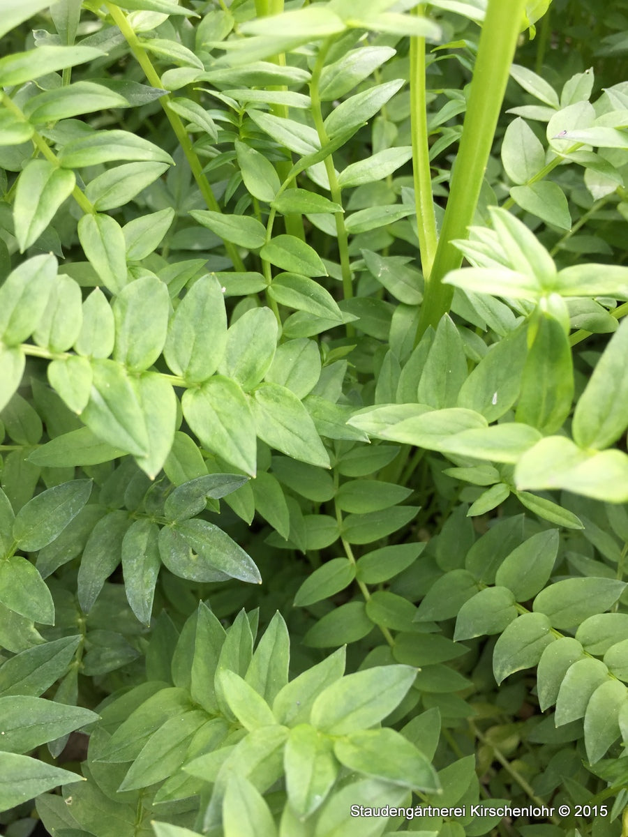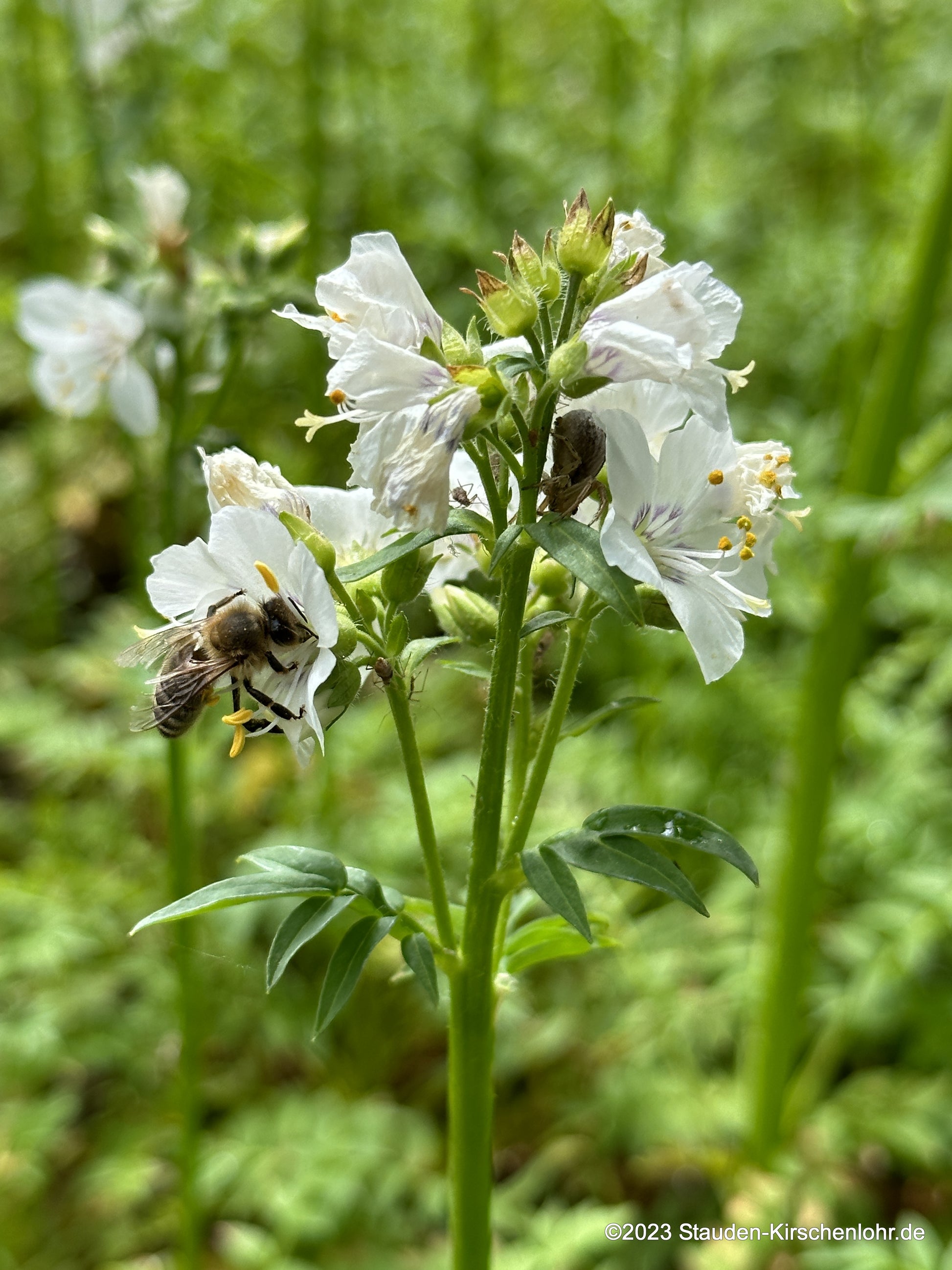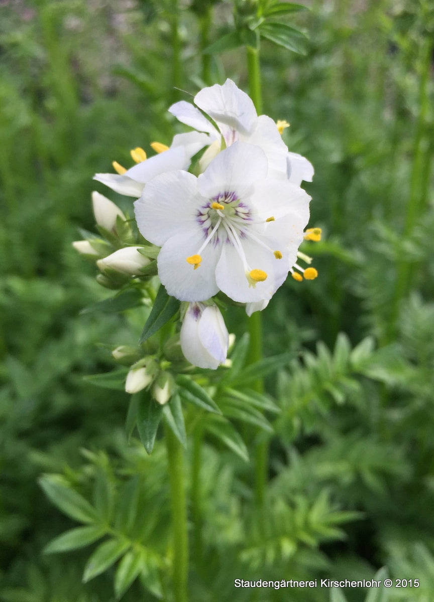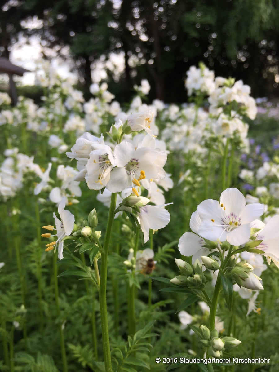 Weiße Schalenblüten, in einem rispentraubigem Blütenstand an aufrechten Stielen. Elegant gefiedertes, hellgrünes Laub.