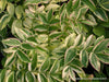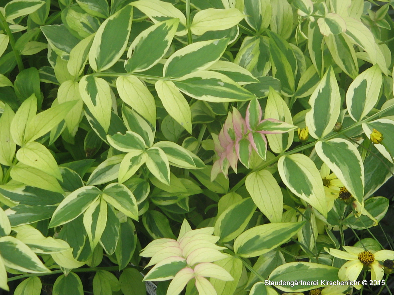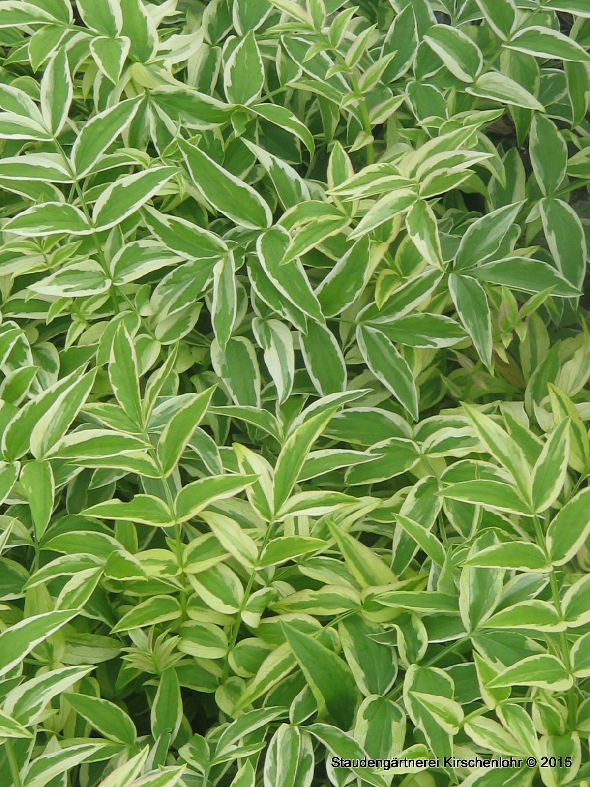 Himmelblaue Schalenblüten, in einem rispentraubigem Blütenstand an aufrechten Stielen. Elegant gefiedertes Laub. Im Austrieb rosagerandete, später cremeweiße Blattränder. Sehr interessant und Farbenfroh.