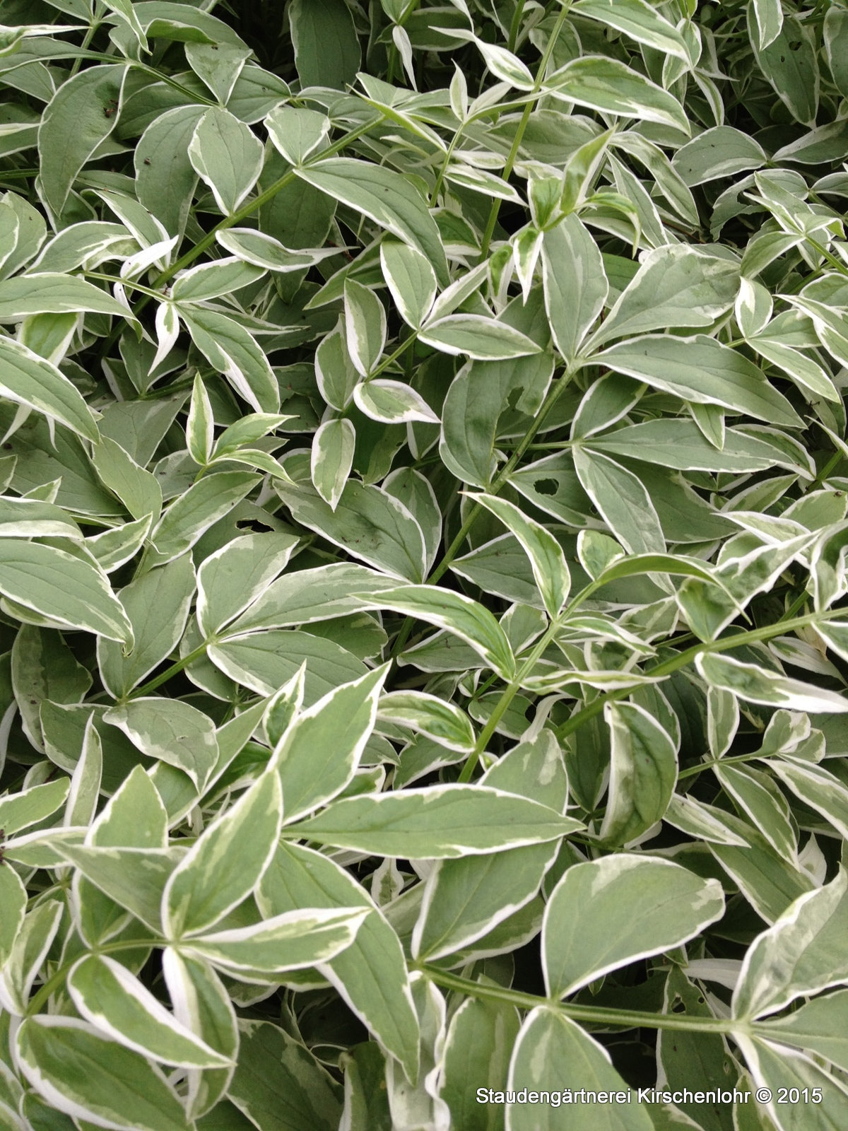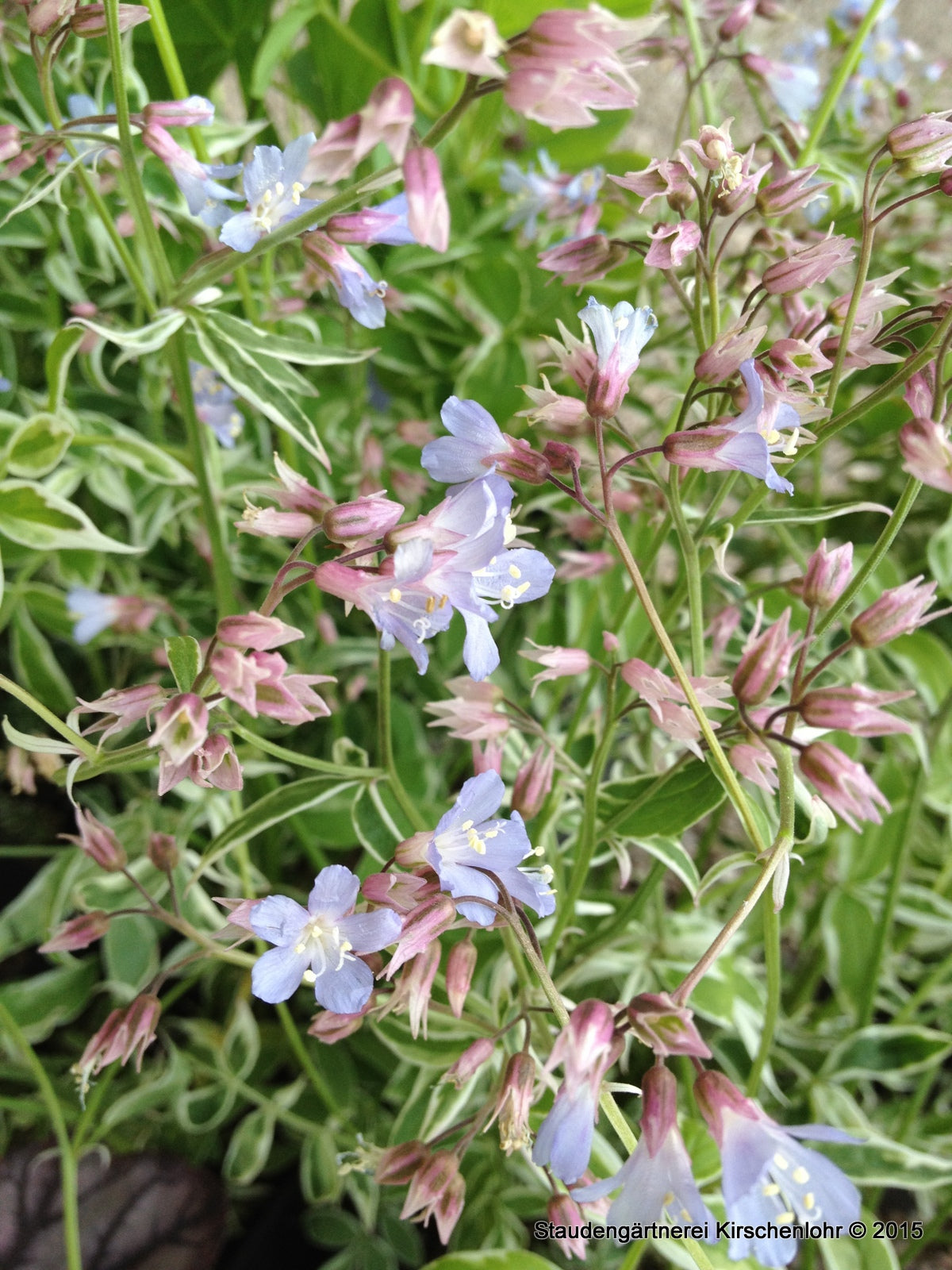 Himmelblaue Schalenblüten, in einem rispentraubigem Blütenstand an aufrechten Stielen. Elegant gefiedertes Laub. Im Austrieb rosagerandete, später weiße Blattränder. Sehr interessant und Farbenfroh.