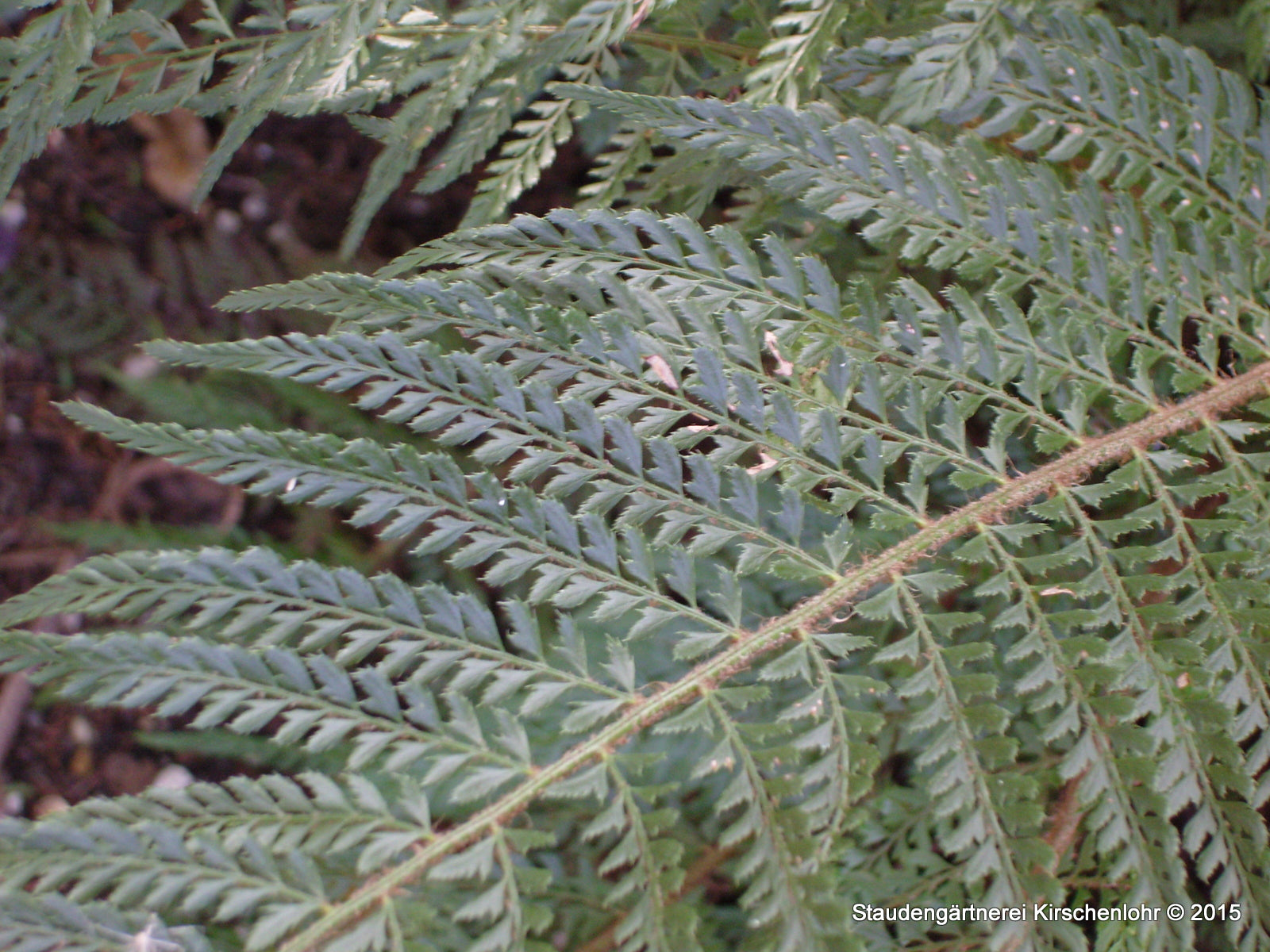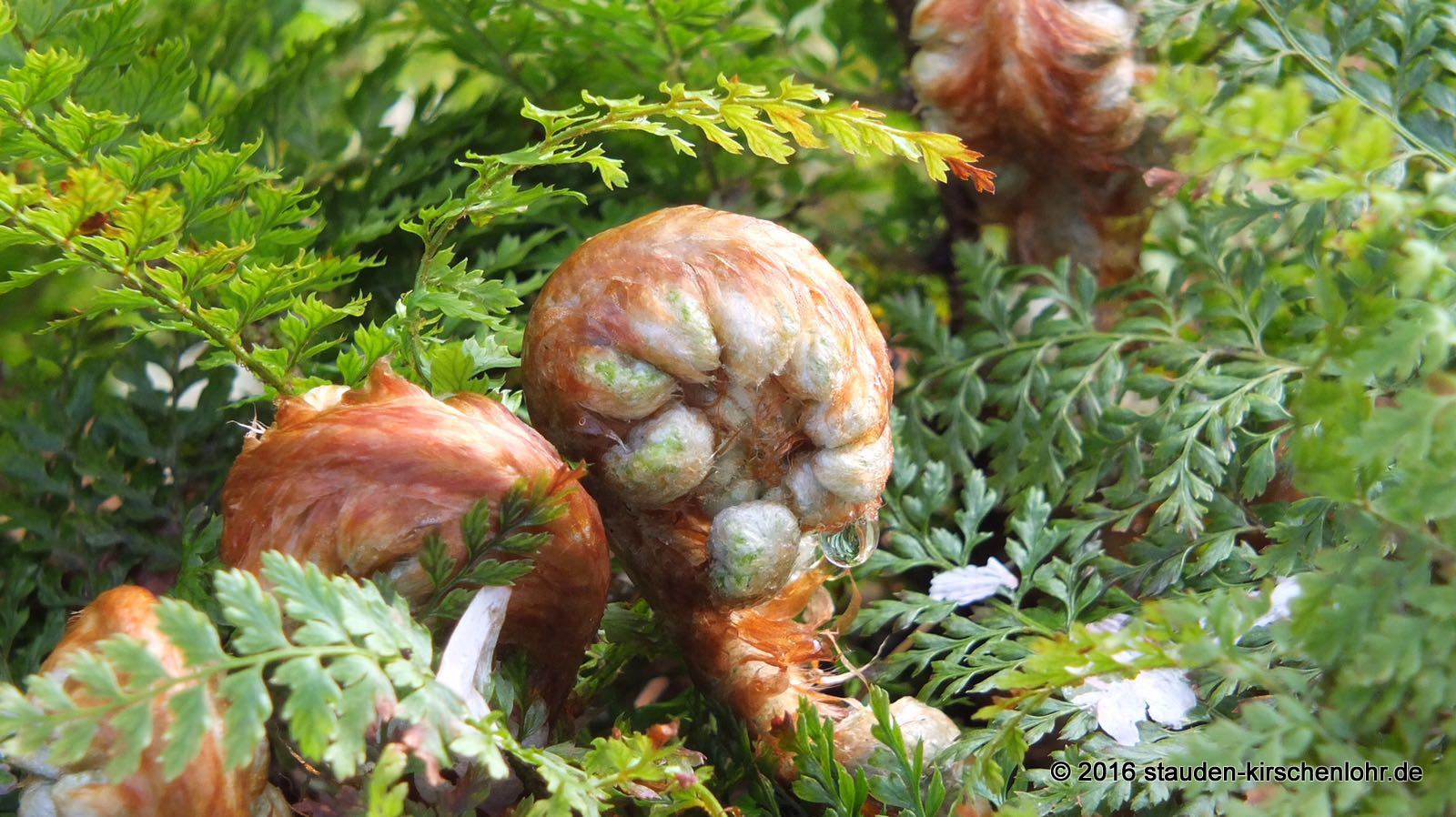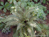 Außergewöhnlicher Farn mit dem gleichmäßigsten Wuchs. Weich wirkende, lederartige, dunkelgrüne, überhängende und zweifach gefiederte Wedel. Steril! Wintergrün.