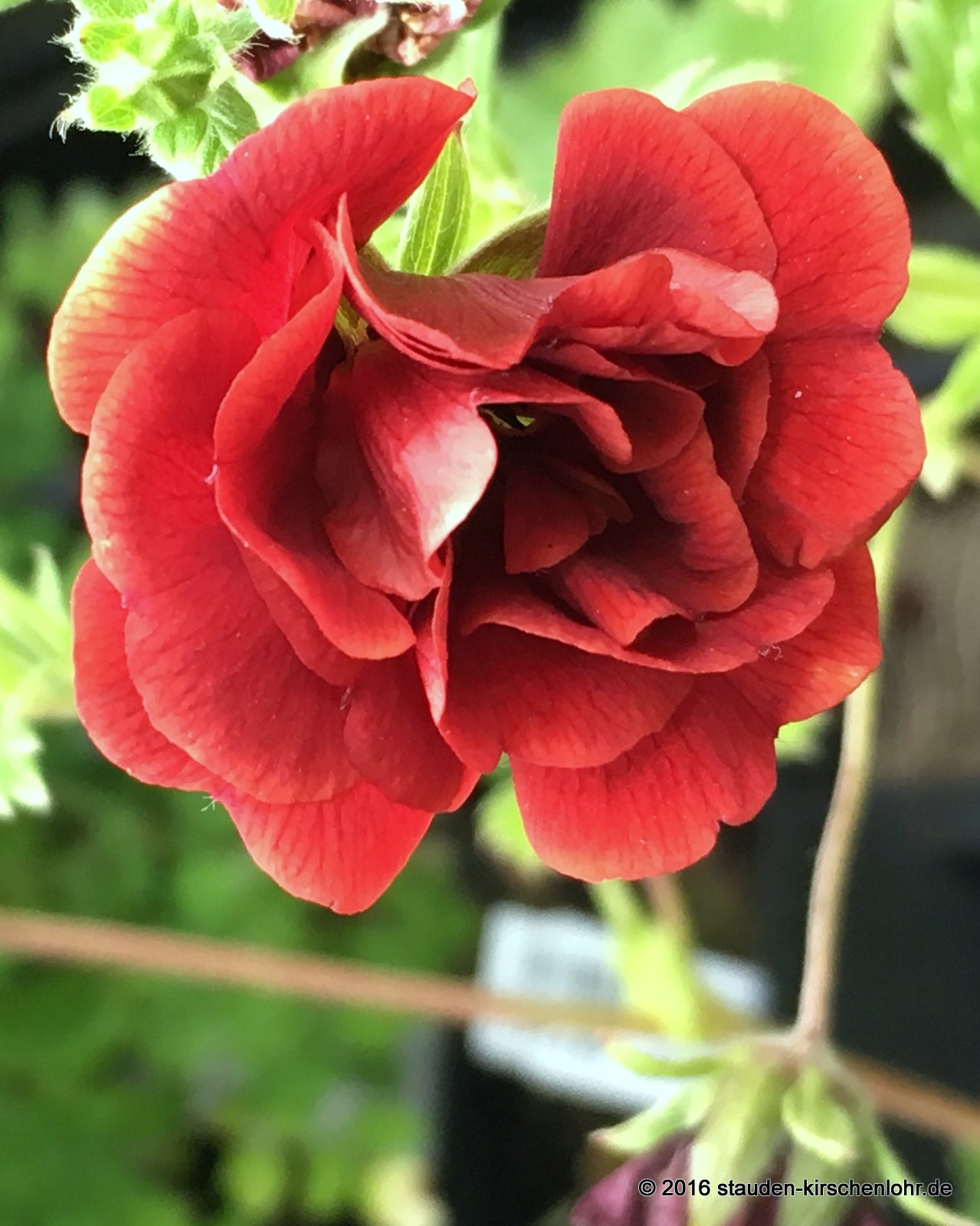 Samtig dunkelrote, halbgefüllte Blüten an aufrechten Stängeln. Dreizählige, fingerförmige Blätter mit gesägten Blatträndern. Sommergrün.