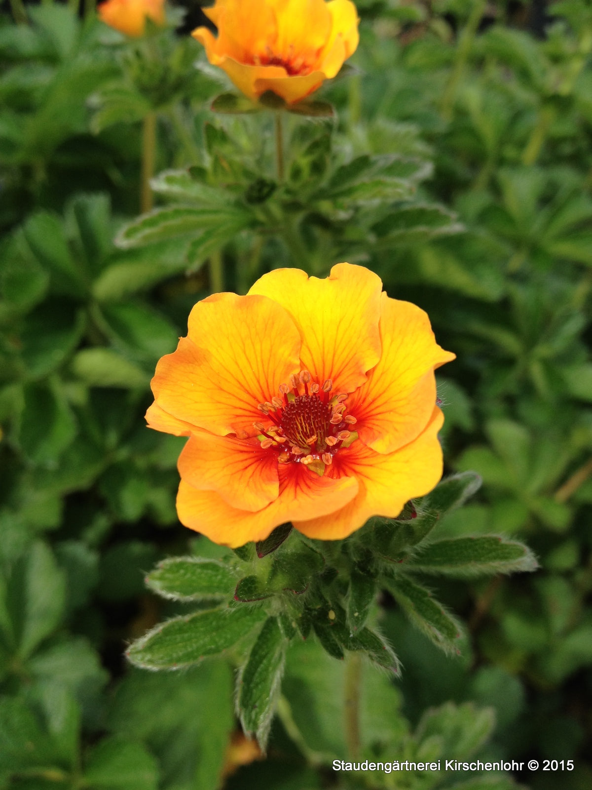 Große, lebhaft apricotorangefarbene Blüten mit rotorange Basalflecken. Fünfzählige, fingerförmige Blätter mit gesägten Blatträndern. Sommergrün.