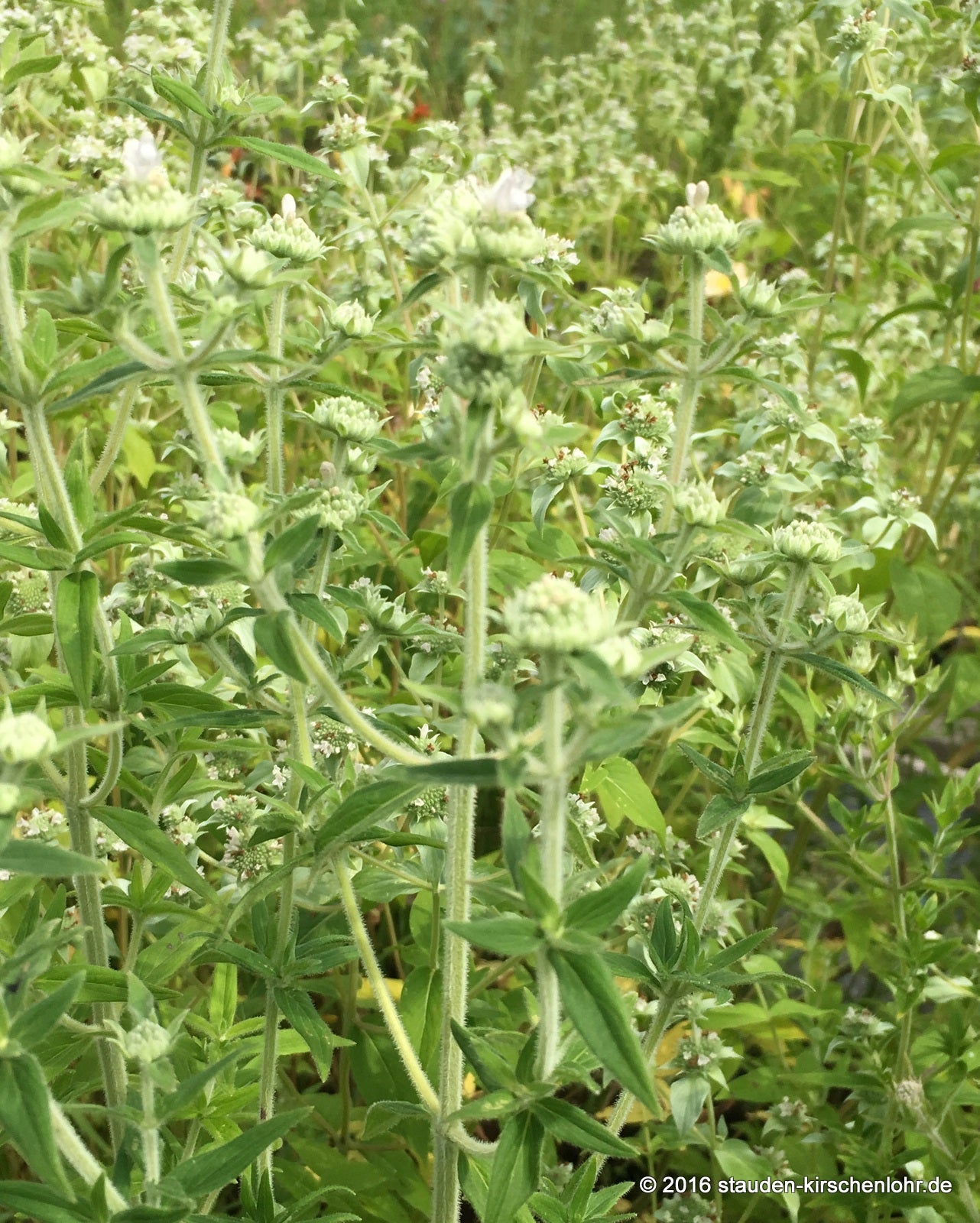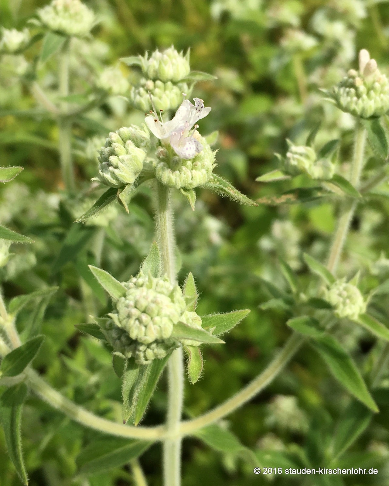 Silbrigweiße Lippenblütchen in quirlartigem Blütenstand. Schmal lanzettliche Blätter mit deutlicher Nervatur. Sommergün. Insektenmagnet.