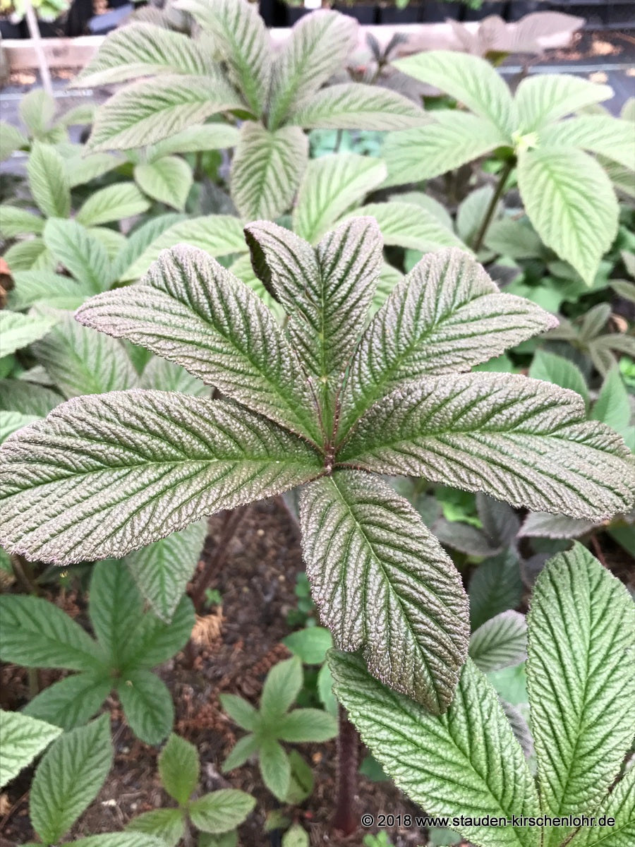 Rosarote Blütenrispen an dunkelroten Stängeln. Fingerförmige Blätter mit auffälliger dunkelbrauner Färbung im Austrieb, später vergrünend. Sommergrün.
