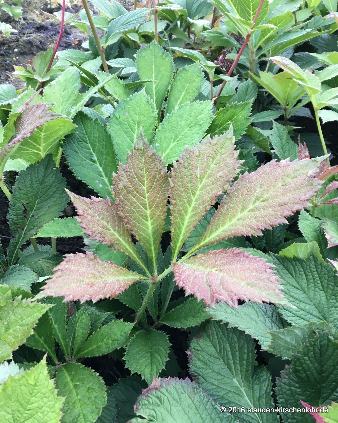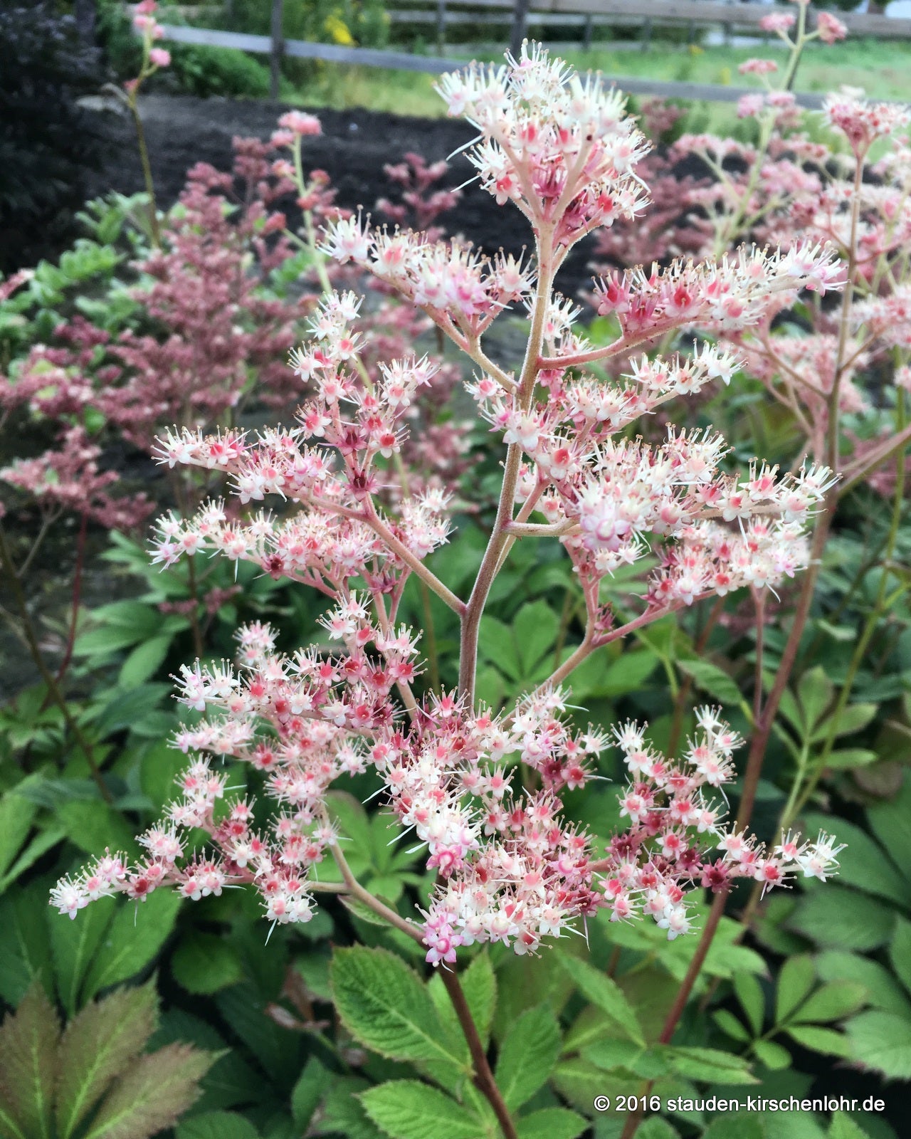 Hellrosa Blüten erscheinen aus tief lachsrosa Knospen. Besonders reichblütig. Gute Blütenschmuckwirkung. Fingerförmige Blätter. Ausladender Wuchs. Sommergrün. Ernst Pagels Züchtung!