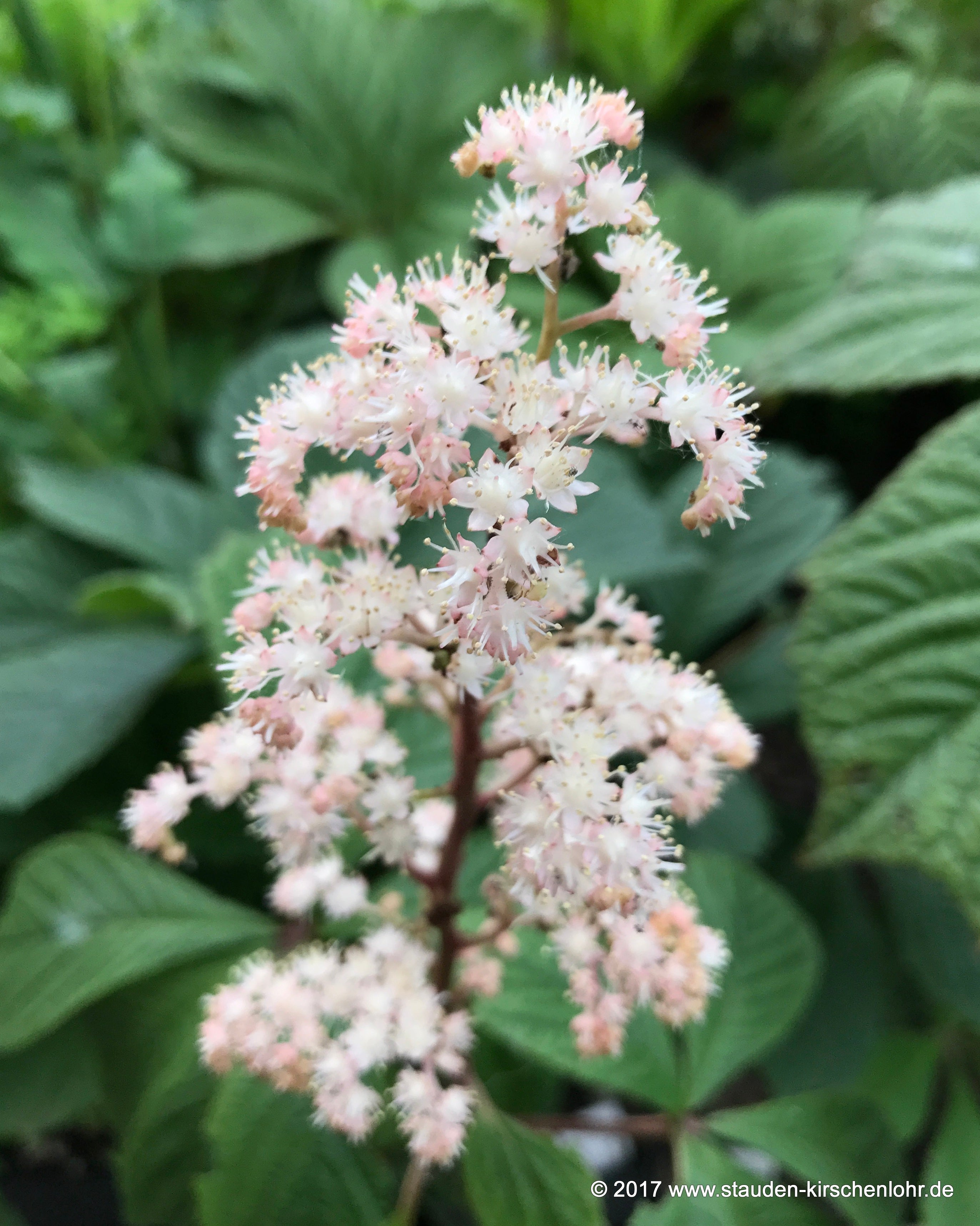 Hellrosa Blüten, bronzefarbenes, leicht rötliches Laub.