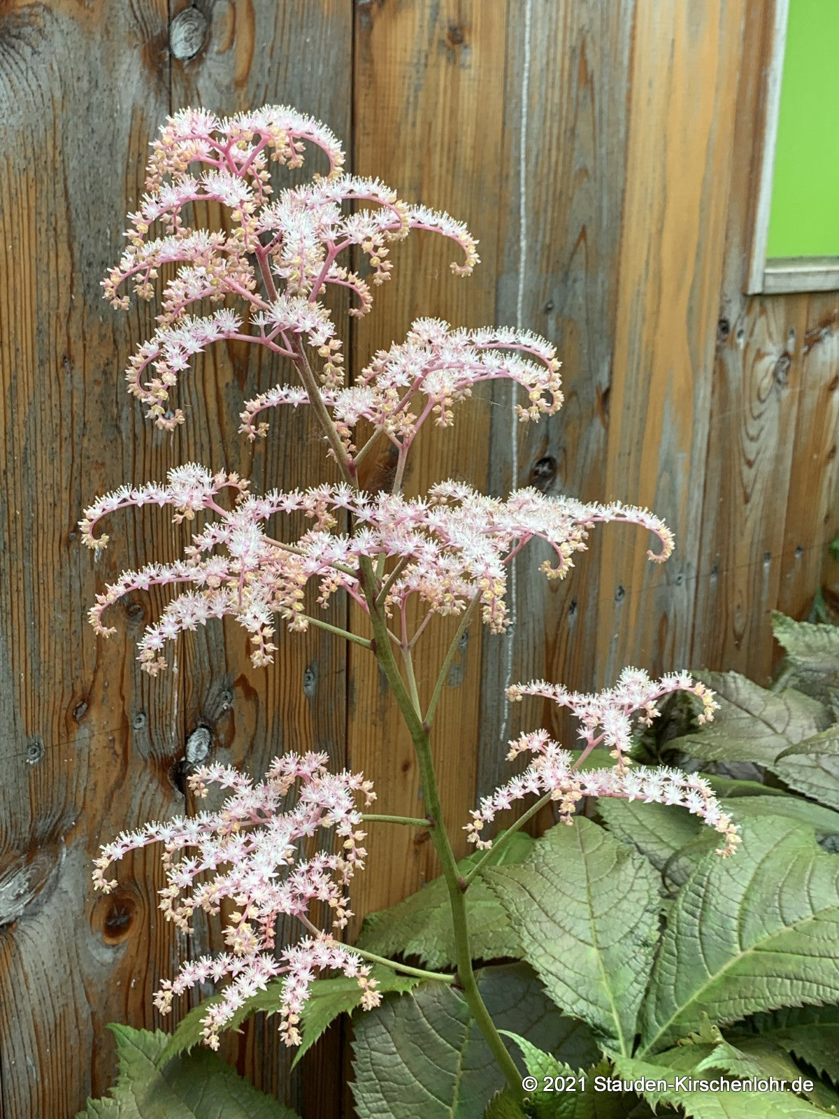 Zartrosa Blüten an aufrechten Blütenstängeln. Riesige, handförmige Blätter. Teilblätter am oberen, breiteren Ende, lang und spitz zackig gezähnt bis gelappt. Lange nach dem Austrieb deutlich braunrot, später vergrünend.