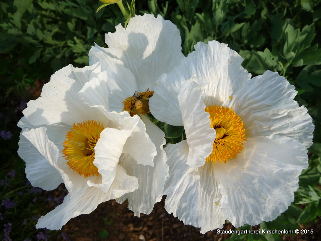 Große, flache, weiße Blütenschalen, meist wellig zerknittert. Auffällige, gelblich orange Staubblätter. Oval bis rundliche Blätter, gefiedert, intensiv blaugrün. Meist nur sommergrün. Etwas ausläuferbildend.