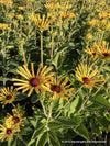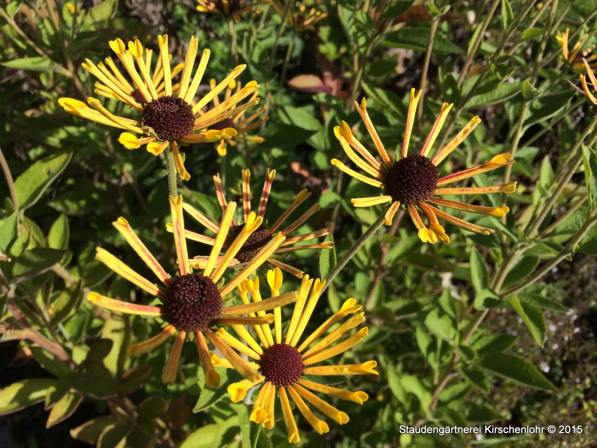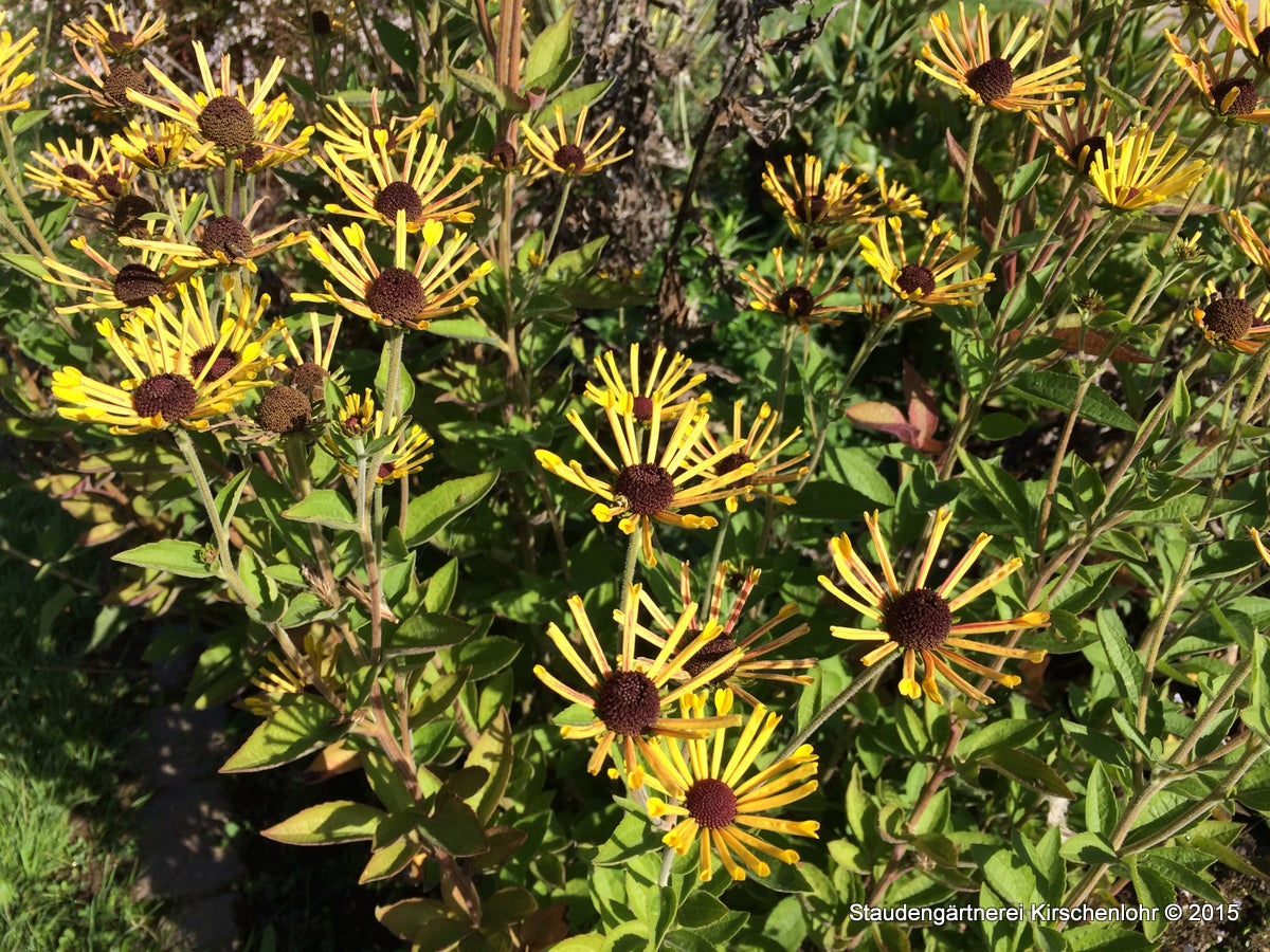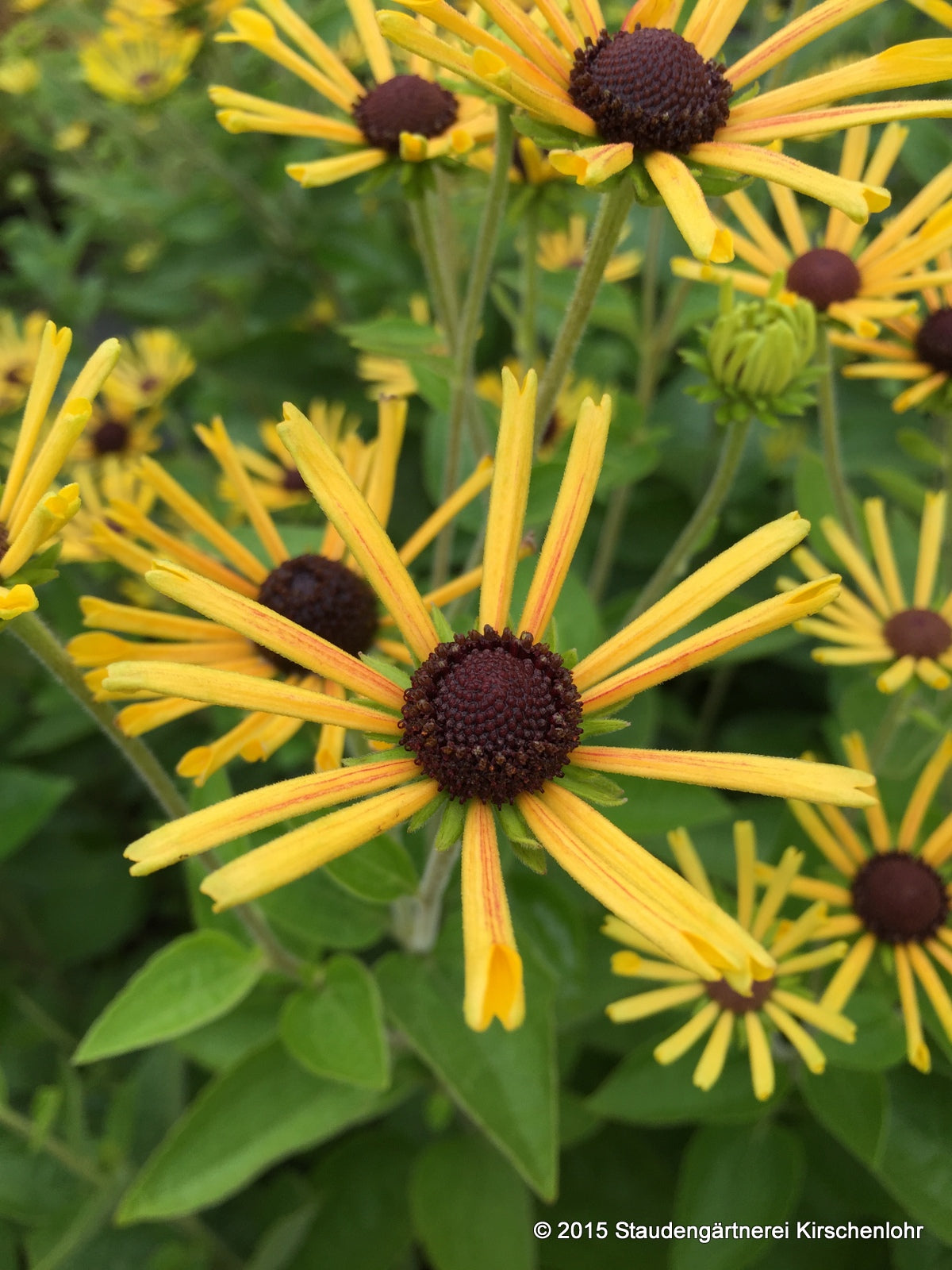 Leuchtend goldgelbe, gerollte Blütenblätter welche wie Röhren wirken. Auffällig schwarzbrauner Blütenboden. Kompakte Auslese. Filzig behaarte, graugrüne, lanzettliche, schwach gesägte Blätter. Sommergrün.