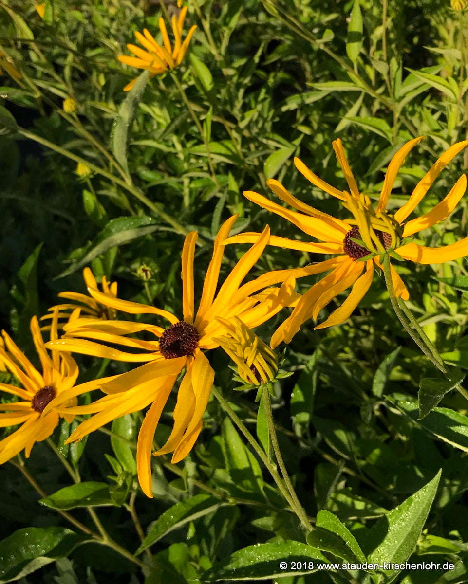 Leuchtend goldgelbe Strahlenblüten mit auffälligem, schwarzbraunen Blütenboden. Filzig behaarte, graugrüne Belaubung. Blätter lanzettlich bis dreiteilig, schwach gesägt. Sommergrün.