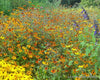 Zweifarbige goldgelbe Blüten mit feurig orangerotem Zentrum. Flachkugelige, schwarzer Scheibe. Extrem reichblühend. Dreizählig gelappte Blätter. Wunderschöne kurzlebige aber versamende Art. Gute Sommergrün.