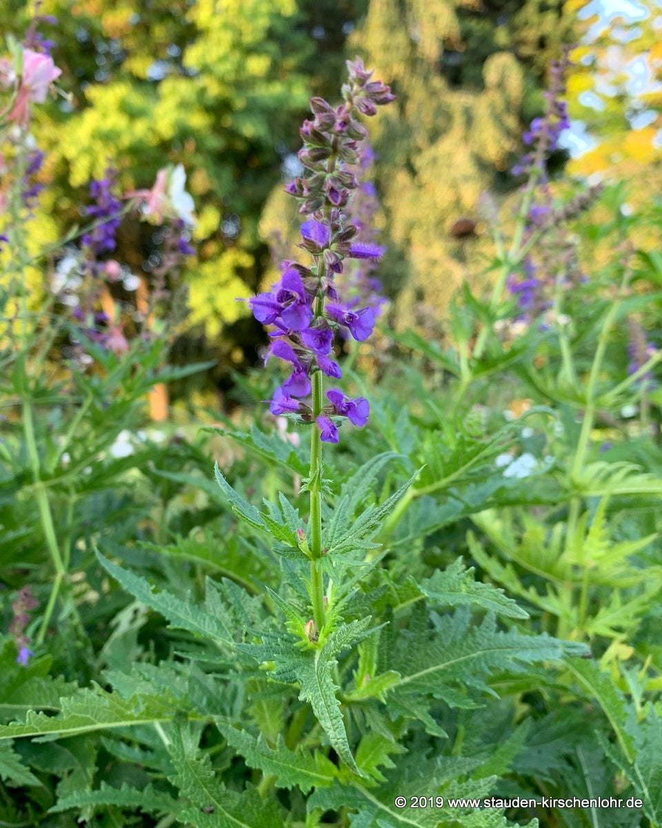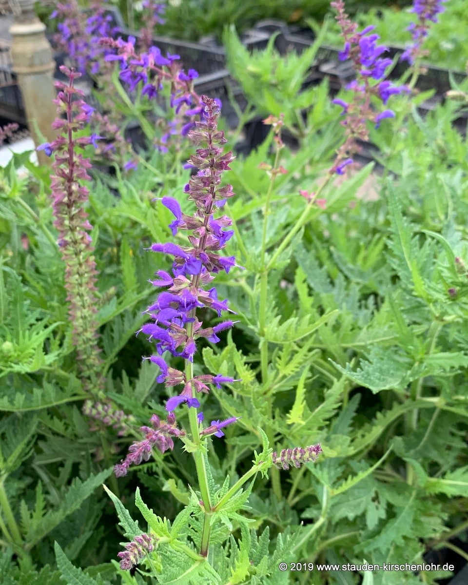 Tolle dunkelblaue Blüten. Auffällige Blätter mit gezahnten fast gefransten Blatträndern. Schön nachblühend. Von Poltermann (Erfurt) im Garten als Sämling gefunden (S.jurisicii x nemorosa).