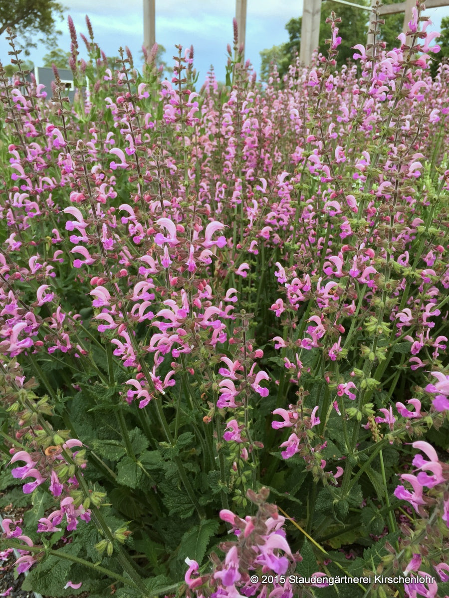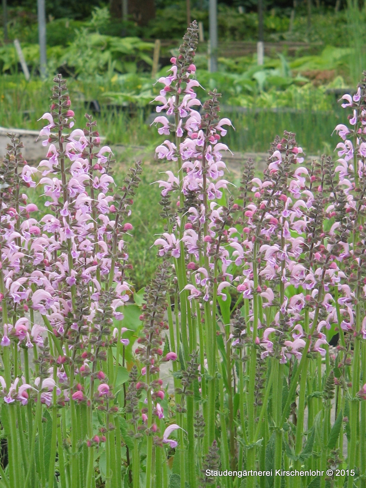 Große, dunkelblaue Lippenblüten an straff aufrechten Stängeln. Der Blütenstand ist quirlständig in einer aufrechten Scheinähre. Tiefgrüne, breitlanzettliche Blätter mit gezahntem Blattrand. Sommergrün.