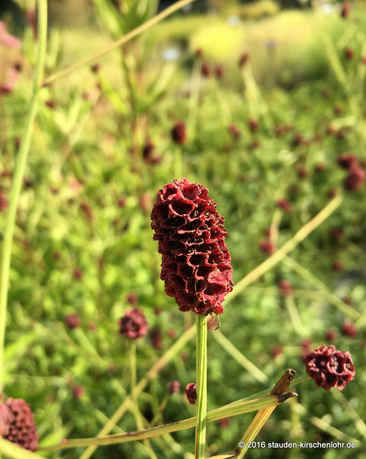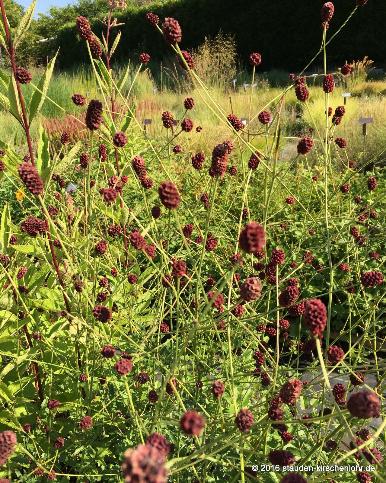 Kurze, fast schwarzrote Blütenköpfchen. Elegant an dünnen, drahtartigen, verzweigten Stängeln. Gefiedertes Laub. Sommergrün.