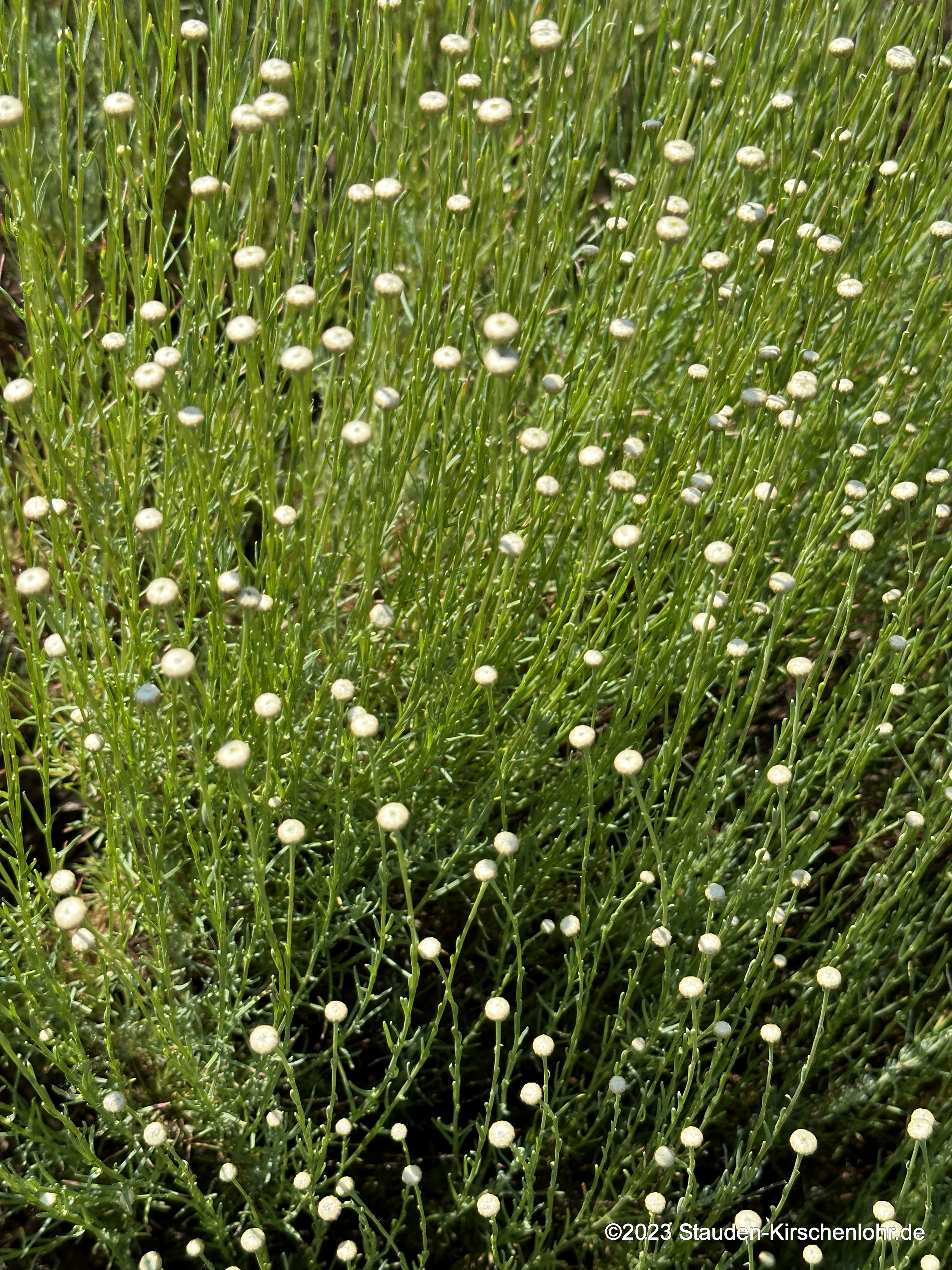 Cremegelbe Röhrenblüten, in leicht kugeliger Form. Schmale, mattgrüne bis gräulichgrüne, lineale Blätter mit gezähntem Blattrand. Immergrün. Nicht identisch mit S. virens! syn. Santolina benthamiana