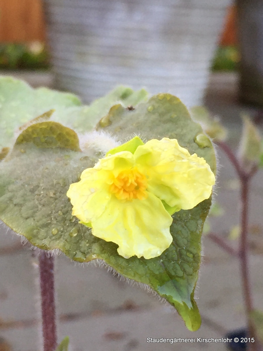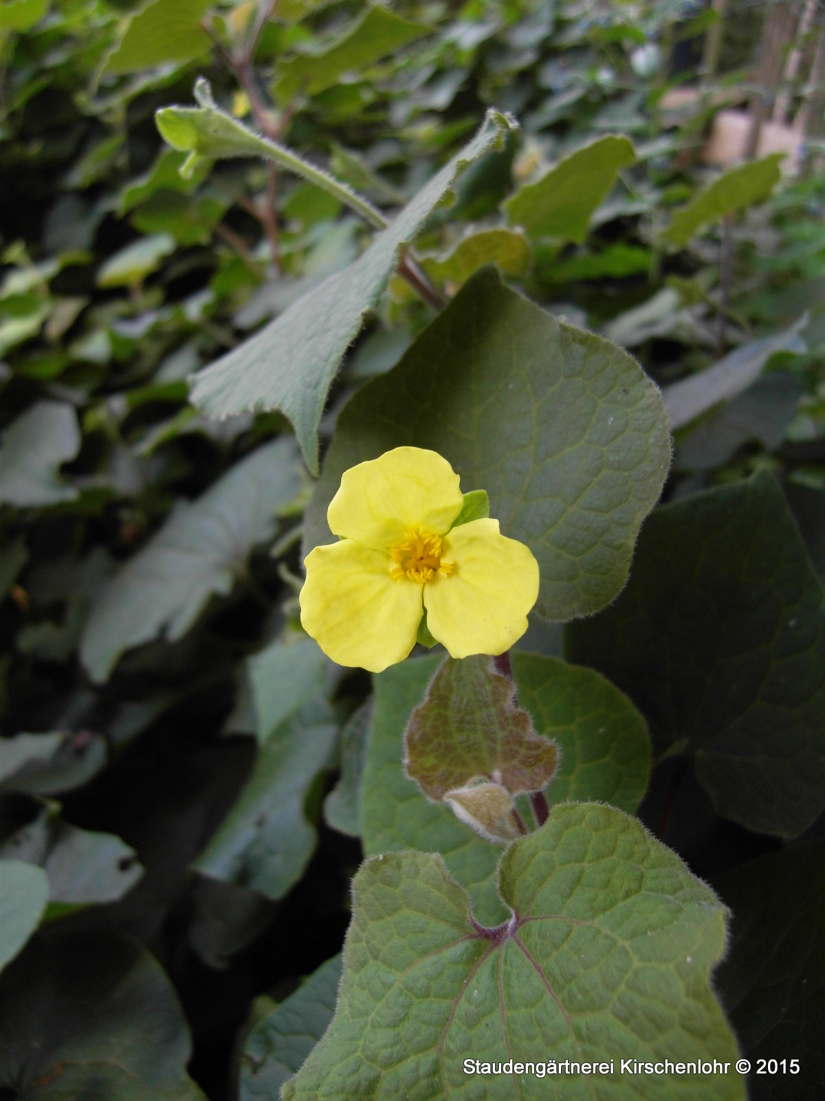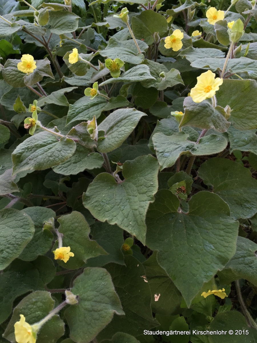 Hell schwefelgelbe Blüten, einzeln Blühend aus den Blattachseln. Herzförmige, filzig behaarte Blätter. Im Austrieb braungrün, später dunkelgrün. Aufrechter Wuchs. Sommergrün.