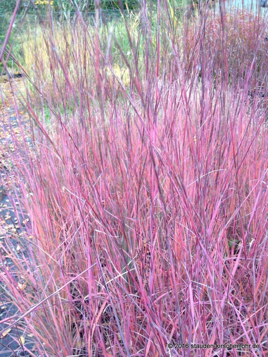 Feinhalmige, leicht nickende Blütenähren. Graublaues, riemenförmiges Laub. Färbt sich im Herbst traumhaft lila bis purpurfarben. Streng horstiges Wuchsverhalten. syn. Andropogon scoparius 'B. H.'