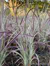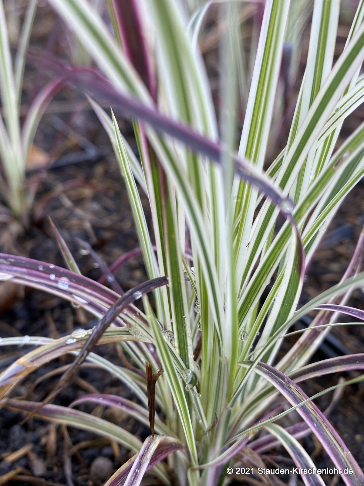 Feinhalmige, leicht nickende Blütenähren. Blaugrünes, intensiv cremeweiß gerandetes, riemenförmiges Laub. Färbt sich im Herbst traumhaft purpurfarben an den Blattspitzen. Streng horstiges Wuchsverhalten. Wunderschöne Selektion von Thierry Delabroye (F). syn. Andropogon scoparius 'Ch.' ®