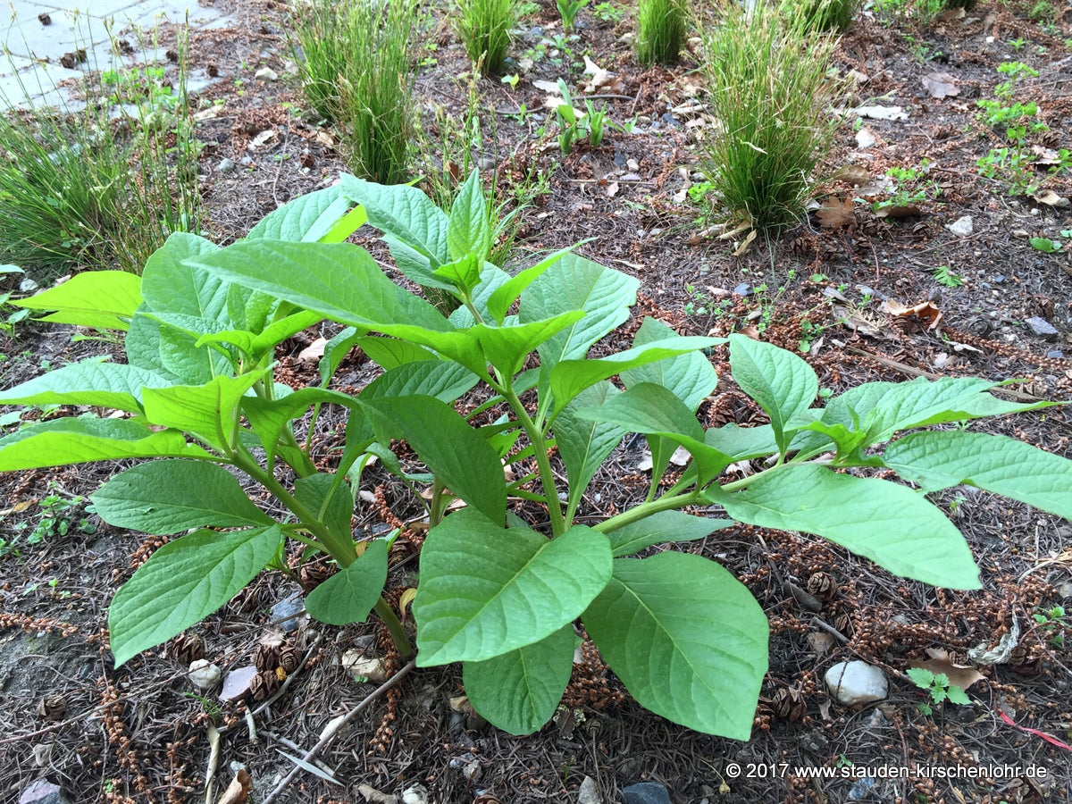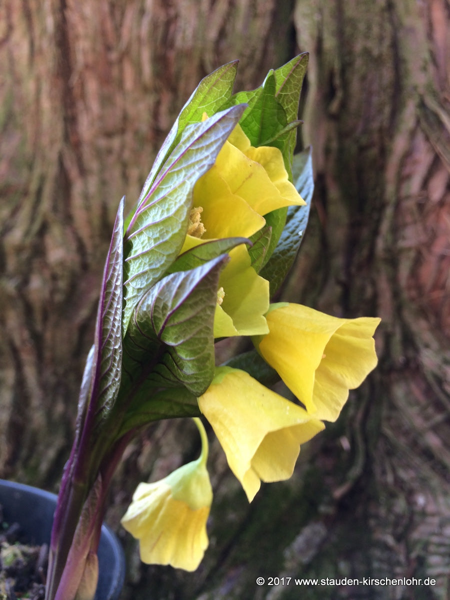 Glockenförmige, reingelbe Blüten. Ovale Blätter mit oberseits deutlicher Nervatur an gabelig verzweigten Stängeln. Sommergrün.