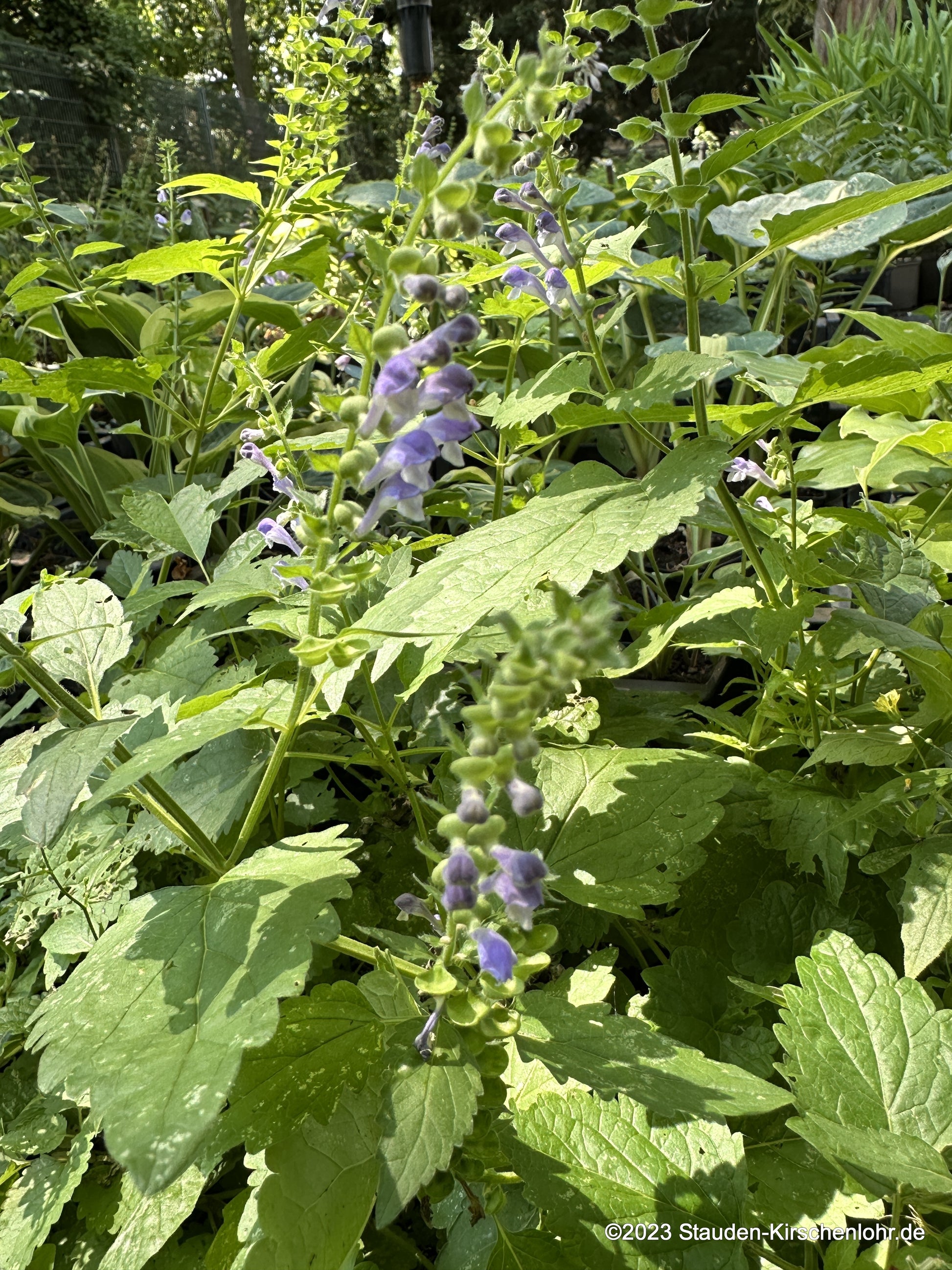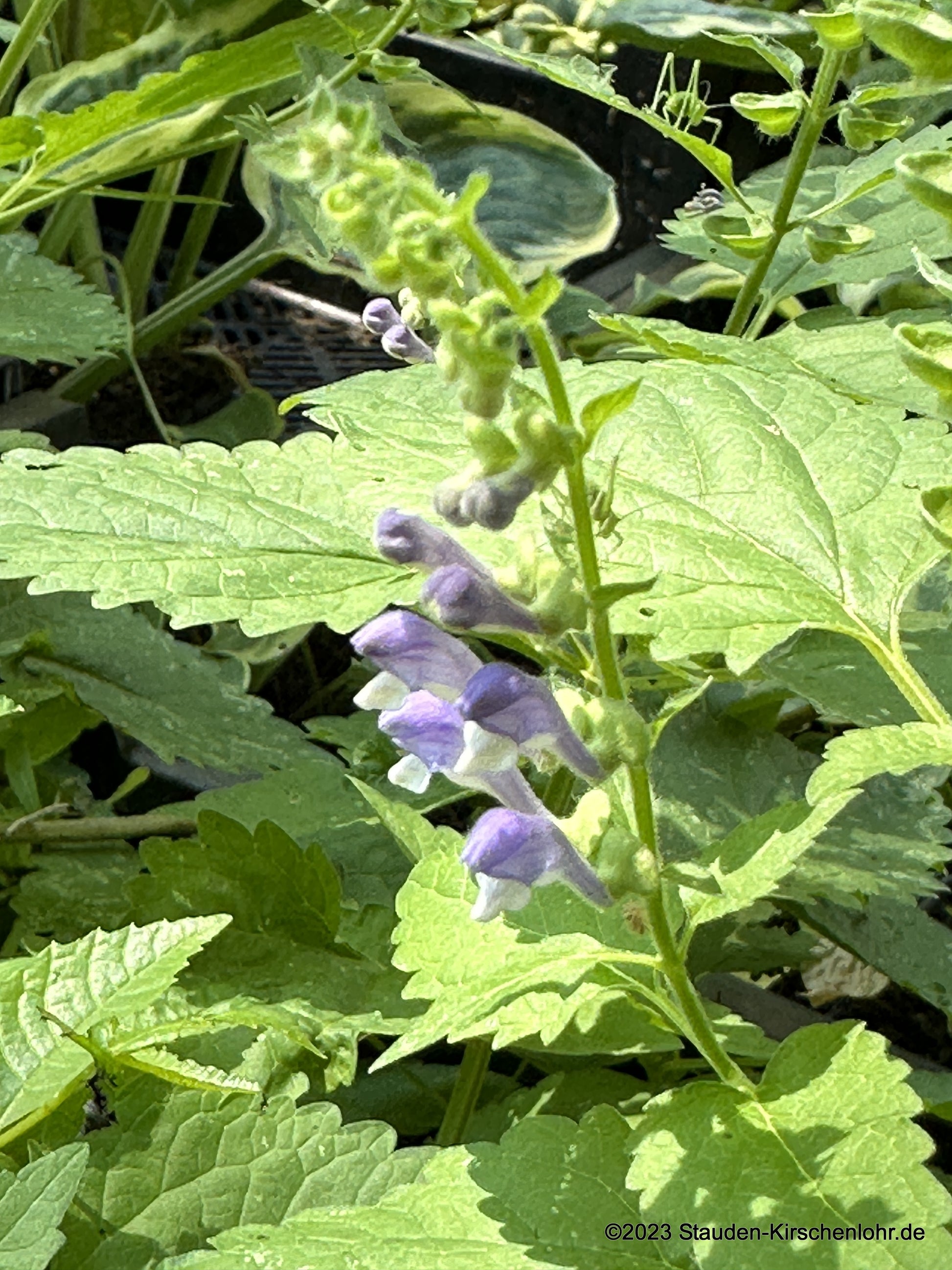 Lippenförmige, hellblaue Blüten in einer Scheinähre, einseitswendig angeordnet. Aufrechte beblätterte Stängel. Eiförmige Blätter mit gesägtem Blattrand. Sommergrün.